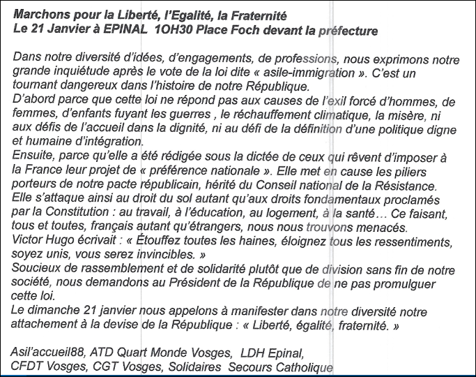 Les associations et syndicats Asile Accueil88, ATD Quart Monde Vosges, LDH Epinal CFDT Vosges CGT Vosges , Solidaires, Secours Catholique appellent à une marche organisée le 21 Janvier à Épinal pour la liberté, la fraternité et l’égalité.