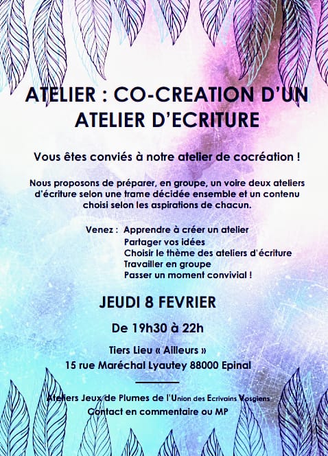 L’Union des Ecrivains Vosgiens (UEV), organise des ateliers d’écritures hebdomadaires et des scènes ouvertes mensuelles au Café associatif Troisième Rive au 15 rue Maréchal Lyautey, à Epinal.