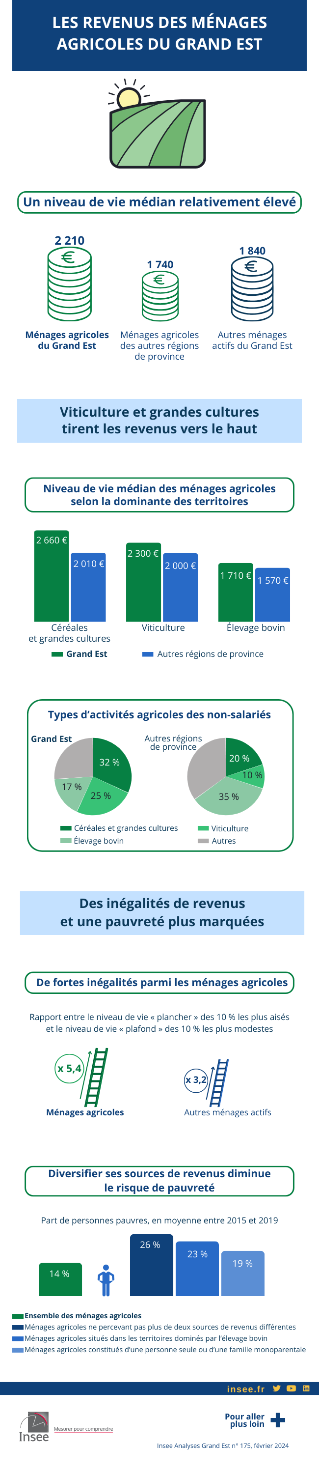 Le Grand Est est la région de province où les ménages agricoles ont le niveau de vie médian le plus élevé. Cette situation s’explique en partie par le poids important qu’occupent la viticulture et l’exploitation de grandes cultures, des activités qui génèrent des revenus supérieurs à la moyenne.