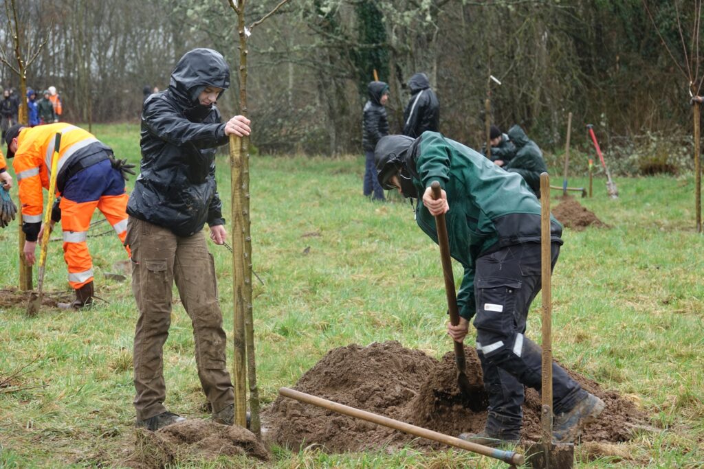 Une trentaine d’élèves de niveau BTS BP de l’École de Roville-ayx-Chênes, accompagnés de leurs professeurs, 3 personnes de l’entreprise à but d’emploi Label Initiative et des agents du service espaces verts étaient sur le pied de guerre jeudi dernier pour planter 25 arbres fruitiers.