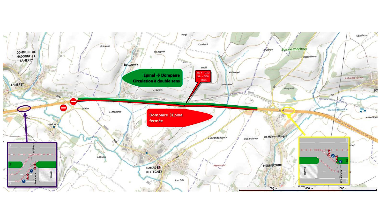 Du 2 au 8 avril 2024, le sens de circulation sur la RD166 entre Dompaire et Epinal sera basculé entre les échangeurs de Madonne-et-Lamerey et Hennecourt.