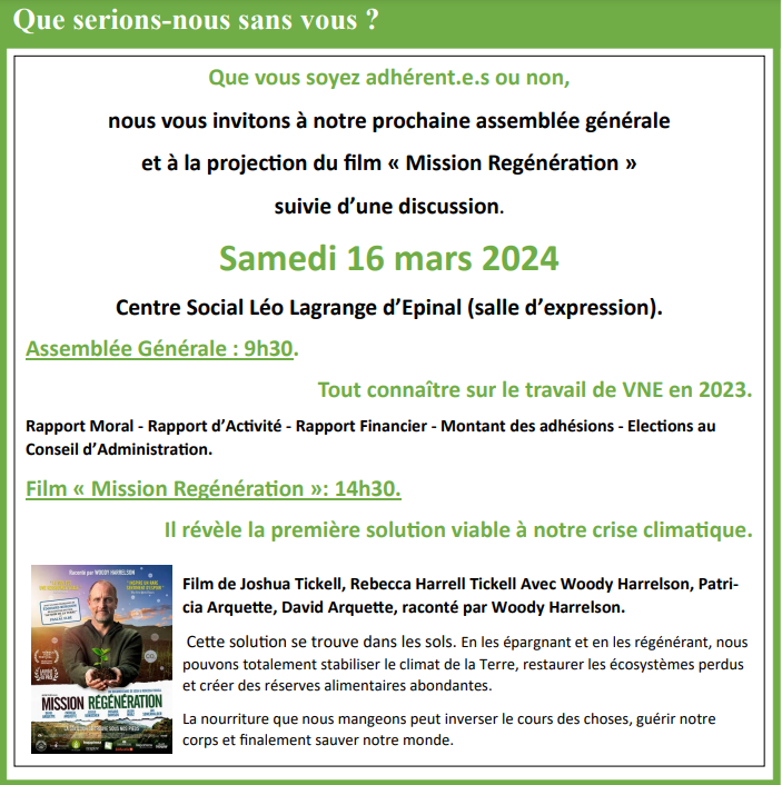 Ce temps d’échange sera l’occasion pour nous de présenter les différents dossiers environnementaux qui nous ont occupés au cours de l’année passée. L’AG sera suivie d’un verre de l’amitié et d’un repas tiré du sac, puis d’une projection et d’un débat du film « Mission Régénération » à 14h30.
