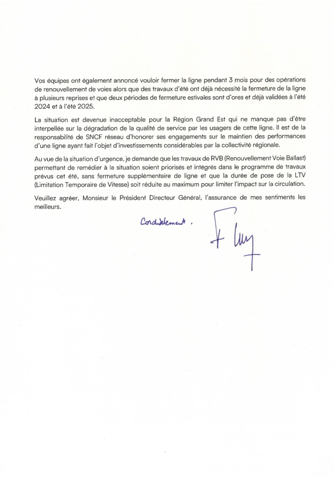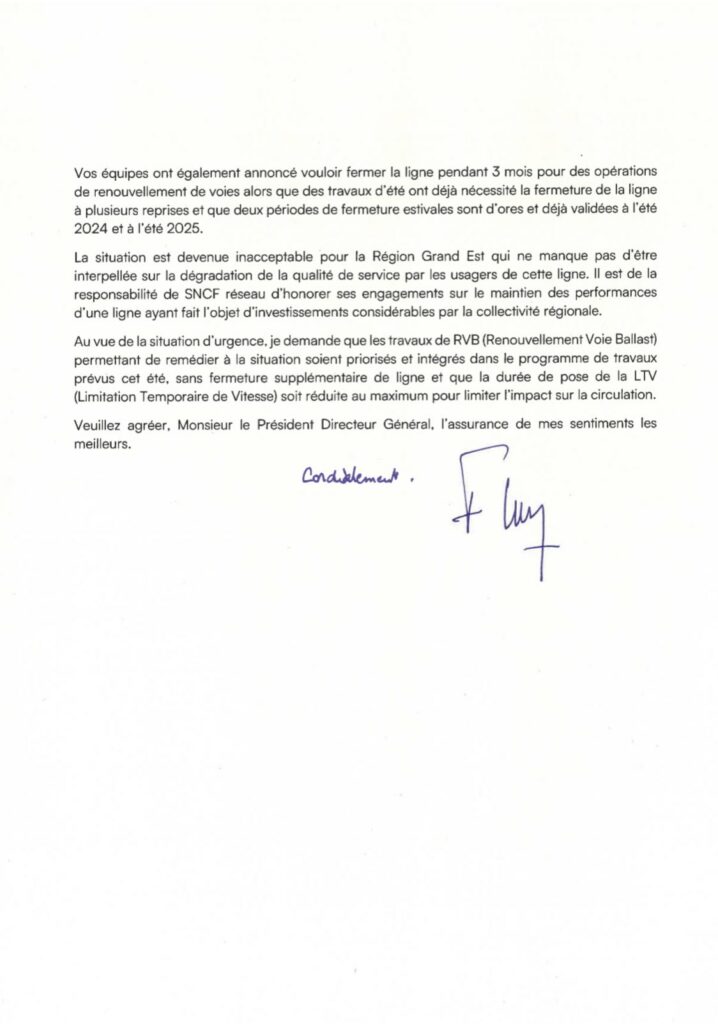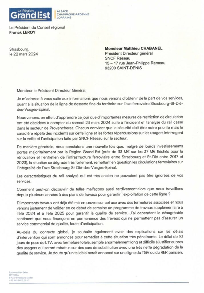 Une situation que déplore Franck Leroy, président du Conseil Départemental du Grand Est, dans une lettre ouverte publiée sur X et adressé à Matthieu Chabanel, PDG de SNCF Réseau. « Chacun convient que la sécurité doit être notre priorité, mais le caractère répété des incidents sur cette ligne et les fortes répercussions sur les usagers interrogent sur la veille et l’anticipation faite par SNCF Réseau sur le secteur. De manière générale, nous constatons une nouvelle fois que, malgré de lourds investissements portés majoritairement par la Région Grand Est, la situation se dégrade très fortement, remettant en question les circulations ferroviaires sur l’intégralité de l’axe Strasbourg-Saint-Dié-des-Vosges-Epinal. Les caractéristiques du rail analysé, qui est très ancien, ne pouvaient pas être ignorées par vos services. »