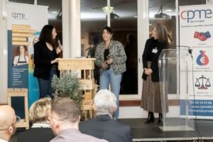 Se sont ensuite enchainées les présentations de la commission Entrepreneure.s, par sa présidente Elizabeth PION et du jury présidé par l’athlète en marche athlétique Clémence BERETTA. A défaut d’avoir pu être présente (et ce, pour la bonne cause, puisqu’elle se trouvait en Chine pour une compétition qui lui a permis de décrocher sa qualification aux Jeux Olympiques), elle nous a envoyé une belle vidéo de soutien et de félicitations aux nominées.Nous avons ensuite eu le plaisir de découvrir les 8 nominées au trophée Création grâce aux vidéos tournées par Romain Chicot de Histoires et Images. Elles ont pu approfondir leur présentation en répondant à quelques questions de Livia Buchler, qui animait la cérémonie. Le verdict fut rendu par notre partenaire Harmonie Mutuelle, représentée par Gaëtan Gavoille, responsable commercial pays vosgien, qui pu remettre le trophée à Adélaïde MAUFFREY créatrice de Circa Diem !