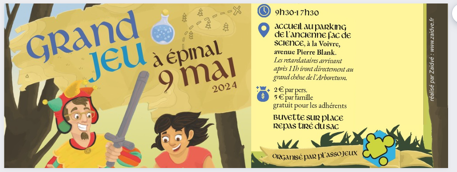 L’association Pl’asso Jeux est heureuse de vous annoncer la 4ème édition de son Grand Jeu qui se déroulera le jeudi 9 mai 2024 de 9h30 à 17h30 à l’Arboretum de la Voivre à Epinal. Ayant d’abord eu lieu au Parc du Cours, au Parc du Château puis à L’île sur La Gosse, cette année, l’événement se déroule à la Voivre.