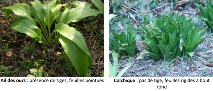 Ail des ours : présence de tiges, feuilles pointues Colchique : pas de tige, feuilles rigides à bout rond.