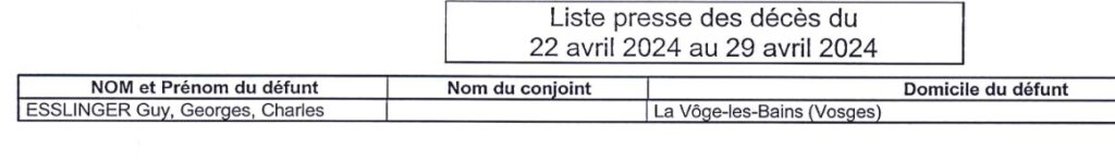 Deprecated: Use of "parent" in callables is deprecated in /project/VIDEV/web/app/plugins/simple-lightbox/includes/class.options.php on line 501 Les décès du 22 au 29 avril 2024 - Epinal Info