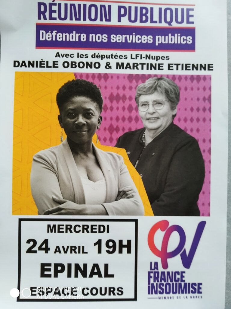LFI organise une reunion publique pour parler des services publics ce mercredi 24 avril à partir de 19h à l’espace cours à Épinal avec les députées LFI Danièle Obono et Martine Etienne.