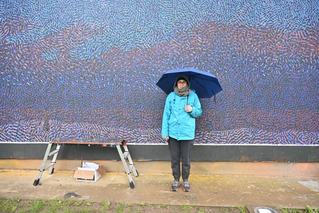 Cette technique qu’elle développe, elle l’abordera par une succession de hachures colorées qui finiront par se combiner dans l’œil du spectateur, proposant plusieurs niveaux de lecture. De loin, une couleur vibrante et lumineuse s’observe et c’est en se rapprochant jusque dans le détail que la palette se divise pour dévoiler chaque couleur qui la compose.. Et les opposés c’est ce qu’elle recherche, réunir le précieux et le trivial, la vie sauvage et la ville ou une délicate figure classique sur un mur surchargé de tags.