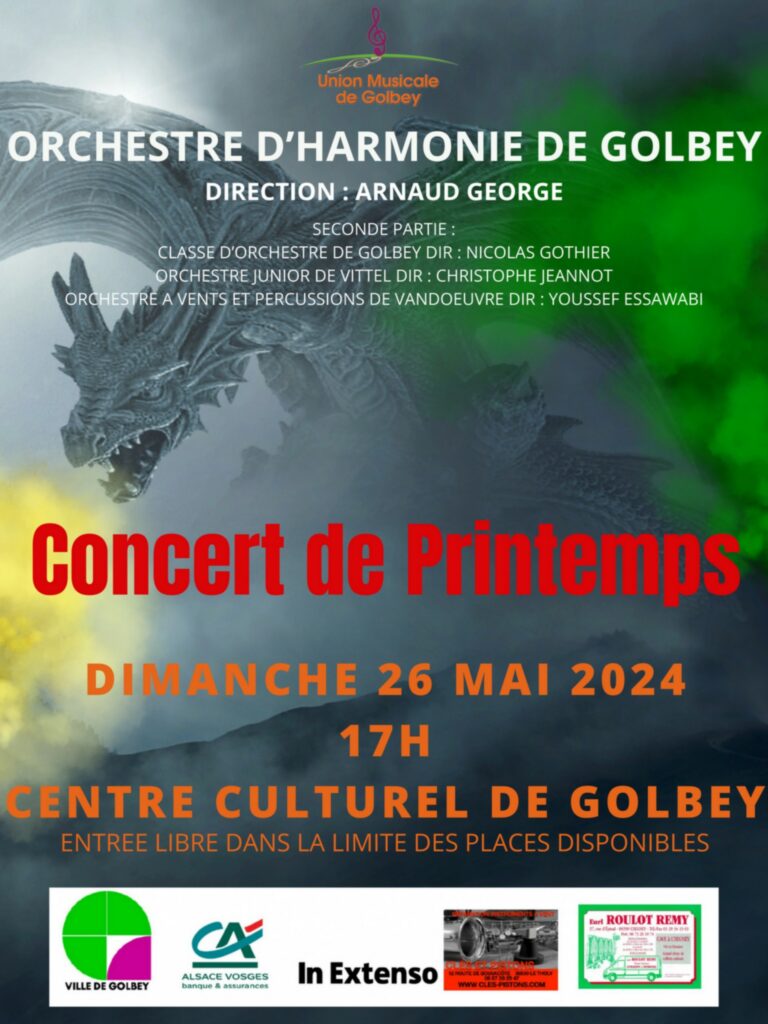 L’Orchestre d’Harmonie de l’Union Musicale de Golbey, sous la baguette d’Arnaud George, organise son Concert de Printemps, dimanche 26 mai à 17 h au Centre Culturel de Golbey.