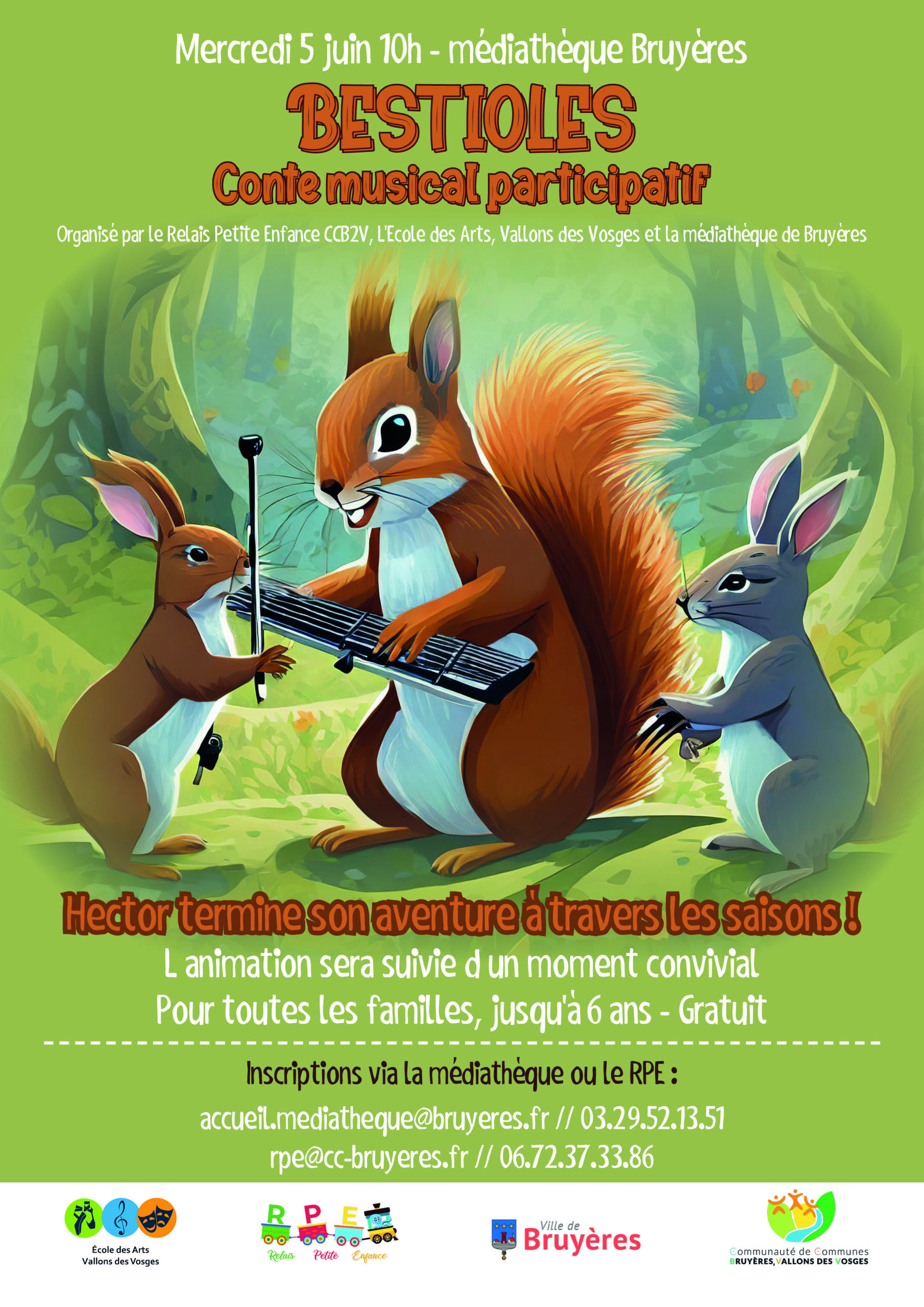 Venez nombreux en famille participer au conte musical participatif BESTIOLES, organisé par le Relais Petite Enfance de la CCB2V, l’Ecole des Arts, Vallons des Vosges et la médiathèque de Bruyères ce mercredi 5 juin à 10h à la médiathèque de Bruyères. L’entrée est gratuite !