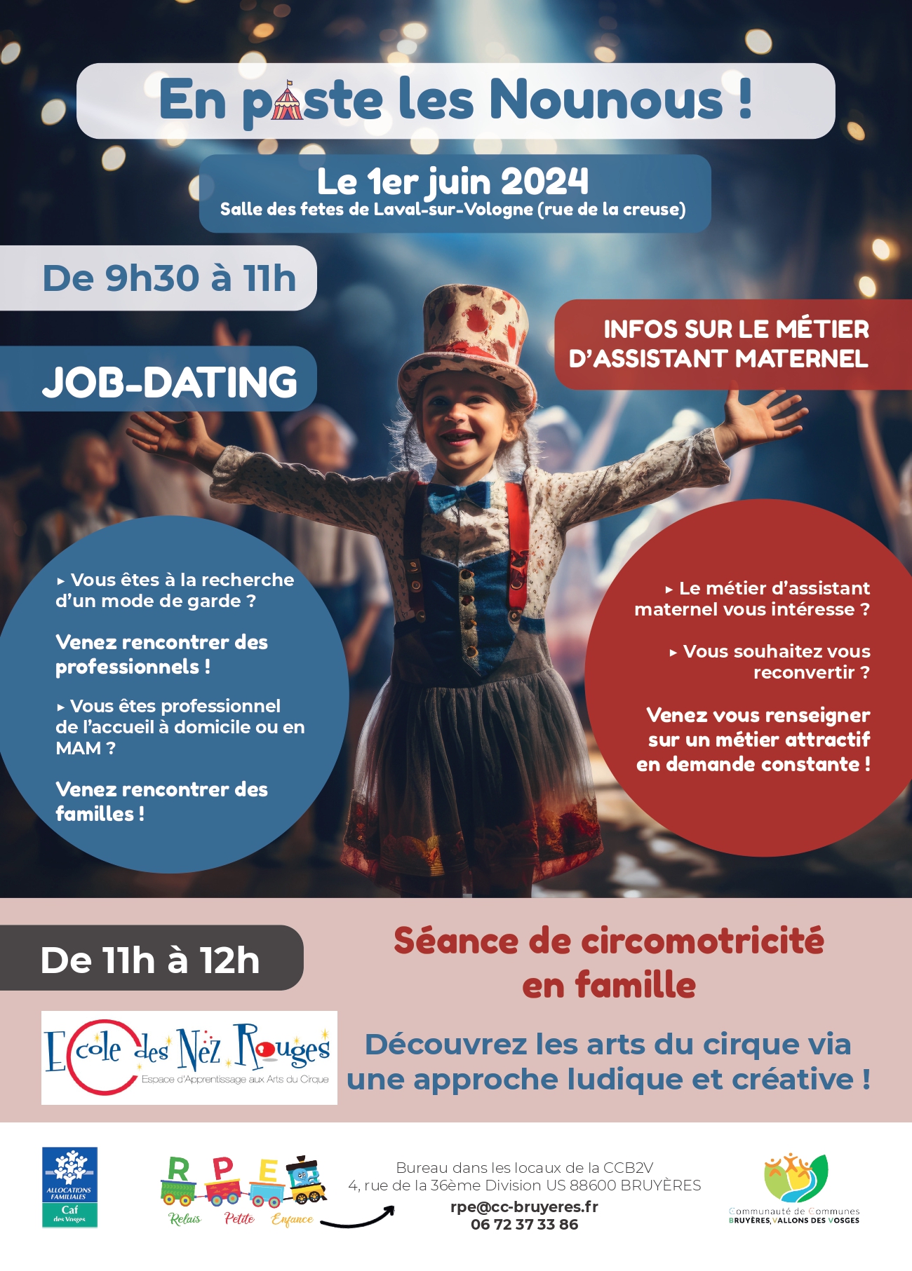 Le Relais Petite Enfance de la CCB2V vous invite à son événement « En piste les nounous » le 1er juin de 9h30 à 12h à la salle des fêtes de Laval-sur-Vologne (rue de la Creuse) !