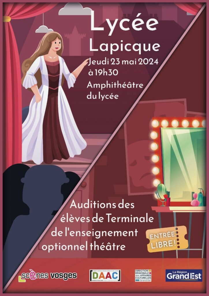 Le lycée Lapicque d’Epinal organise une audition des élèves de Terminale de l’enseignement optionnel théâtre. Rendez-vous jeudi 23 mai à 19h30, amphithéâtre du lycée.