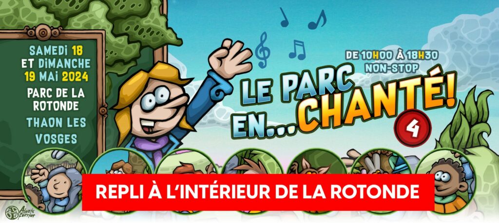 Au vu des conditions météorologiques annoncées ce week-end, le Festival jeunesse Le Parc En…Chanté – 4ème édition se tiendra à l’intérieur de La Rotonde à Thaon les Vosges et non plus dans les parcs.