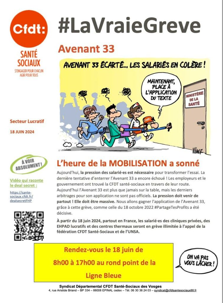 Appel à la grève illimitée de la CFDT secteur Santé Sociaux 88 pour l’application de l’avenant 33 qui régit les métiers des cliniques privées, les établissements médico-sociaux, les EHPAD privés et les établissements thermaux.jeudi 30 avril