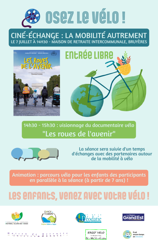 Oserez-vous le Vélo ? avec la Communauté de Communes de Bruyères, Vallons des Vosges. Le dimanche 7 juillet à partir de 14h30, est organisé à la maison de retraite intercommunale de Bruyères un ciné-échange autour de la mobilité autrement.