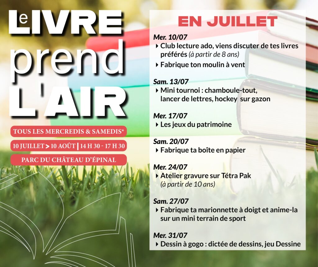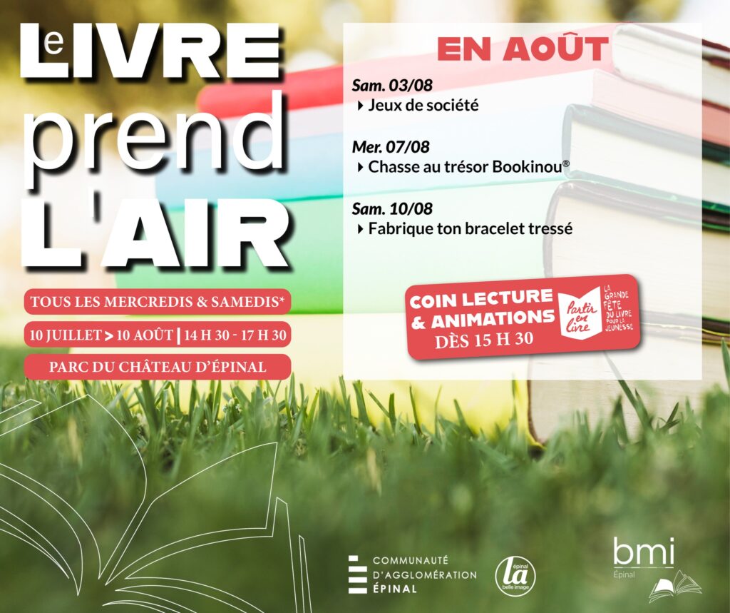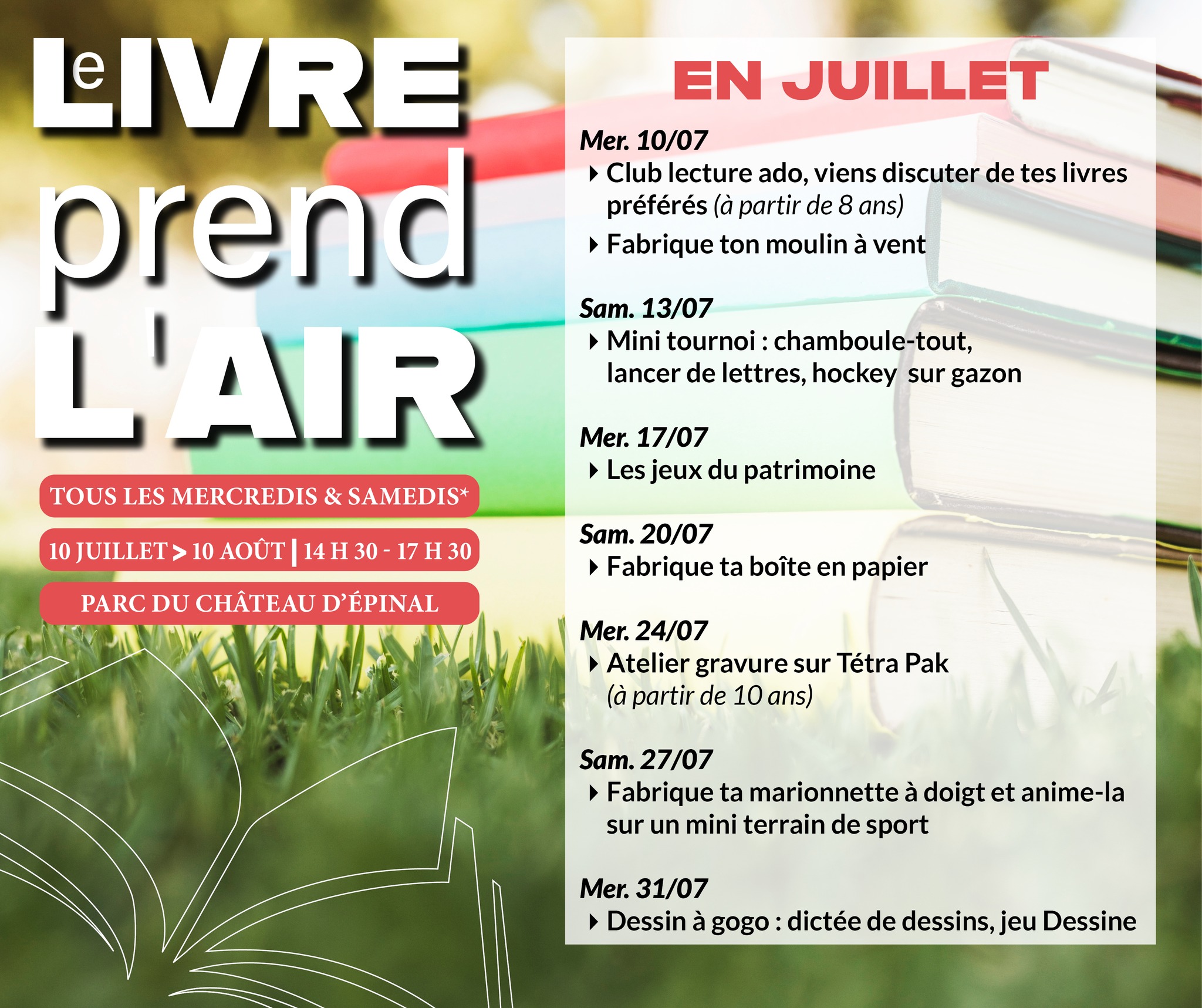 Profitez du beau temps avec les bibliothécaires au Parc du Château d’Epina. Ils vous proposent livres, bd, revues, cd que vous dégusterez bien installés sur les transats ! Tous les mercredis et vendredis après-midi (14h30 – 17h30) du 10 juillet au 10 août.