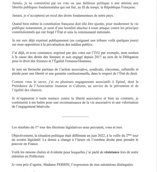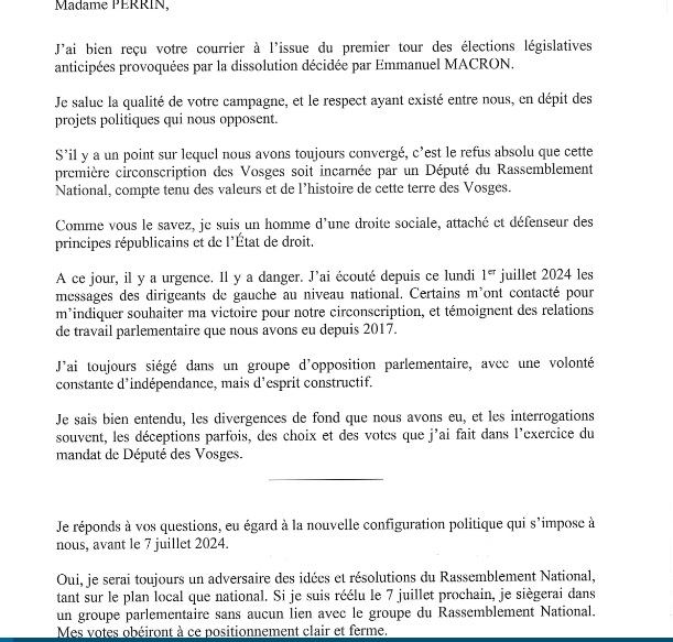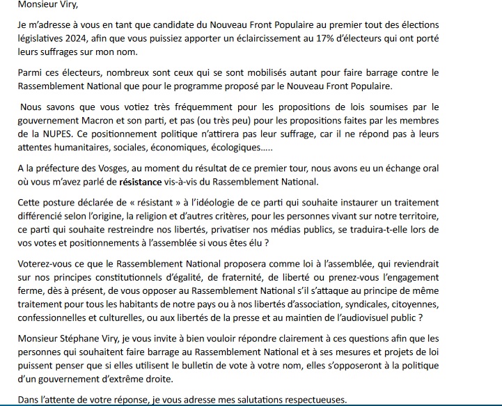Dans la première circonscription des Vosges, celle d’Épinal, la candidate du Nouveau Front populaire, Dominique Perrin a adressé une lettre ouverte au député LR sortant, Stéphane Viry, qualifié pour le second tour. Elle lui demande de se positionner sur plusieurs points.