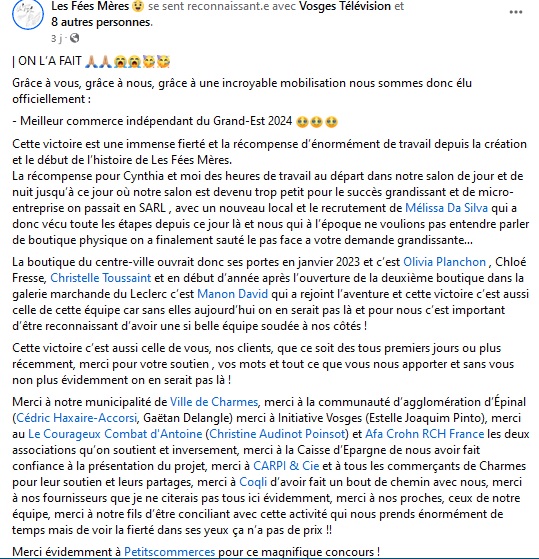 Un bel exemple de réussite ! La petite entreprise « Les Fées Mères » basée à Charmes vient de décrocher un prix. Elle a été élue « Meilleur commerce indépendant du Grand Est 2024 ». Un beau titre qui permet à la boutique vosgienne d’être sélectionnée pour la finale nationale.