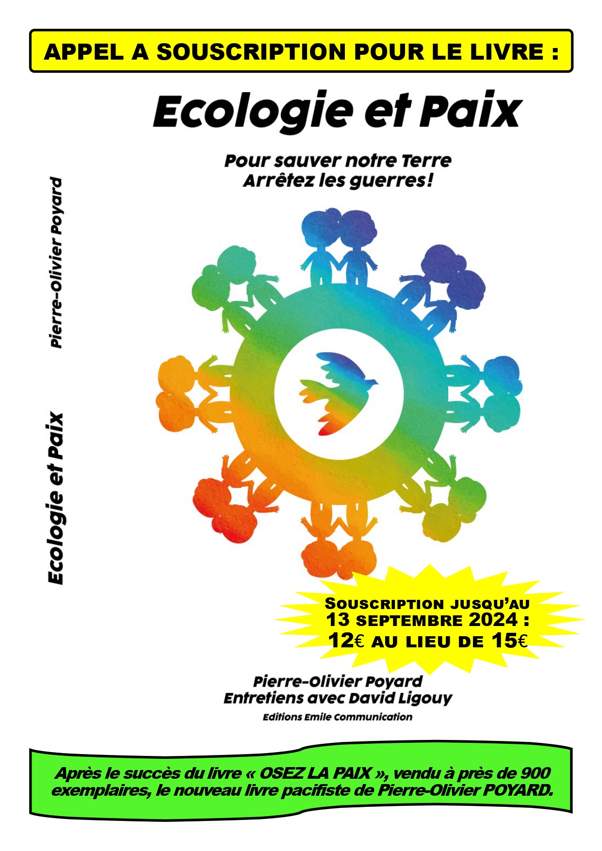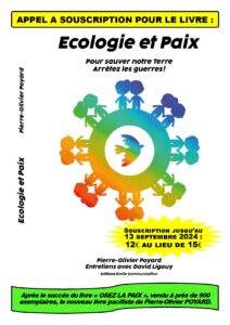 Le nouveau livre de Pierre-Olivier POYARD, « Écologie et Paix: pour sauver notre Terre, arrêtez les guerres », membre du Bureau National du Mouvement de la Paix, est l’objet d’une souscription de lancement, débutée il y a quelques semaines. Sur les 3000€ attendus, 1700€ ont déjà été récoltés, de la part de près d’une quarantaine de souscripteurs. Un courrier à été envoyé la semaine dernière à plus de 700 correspondants.