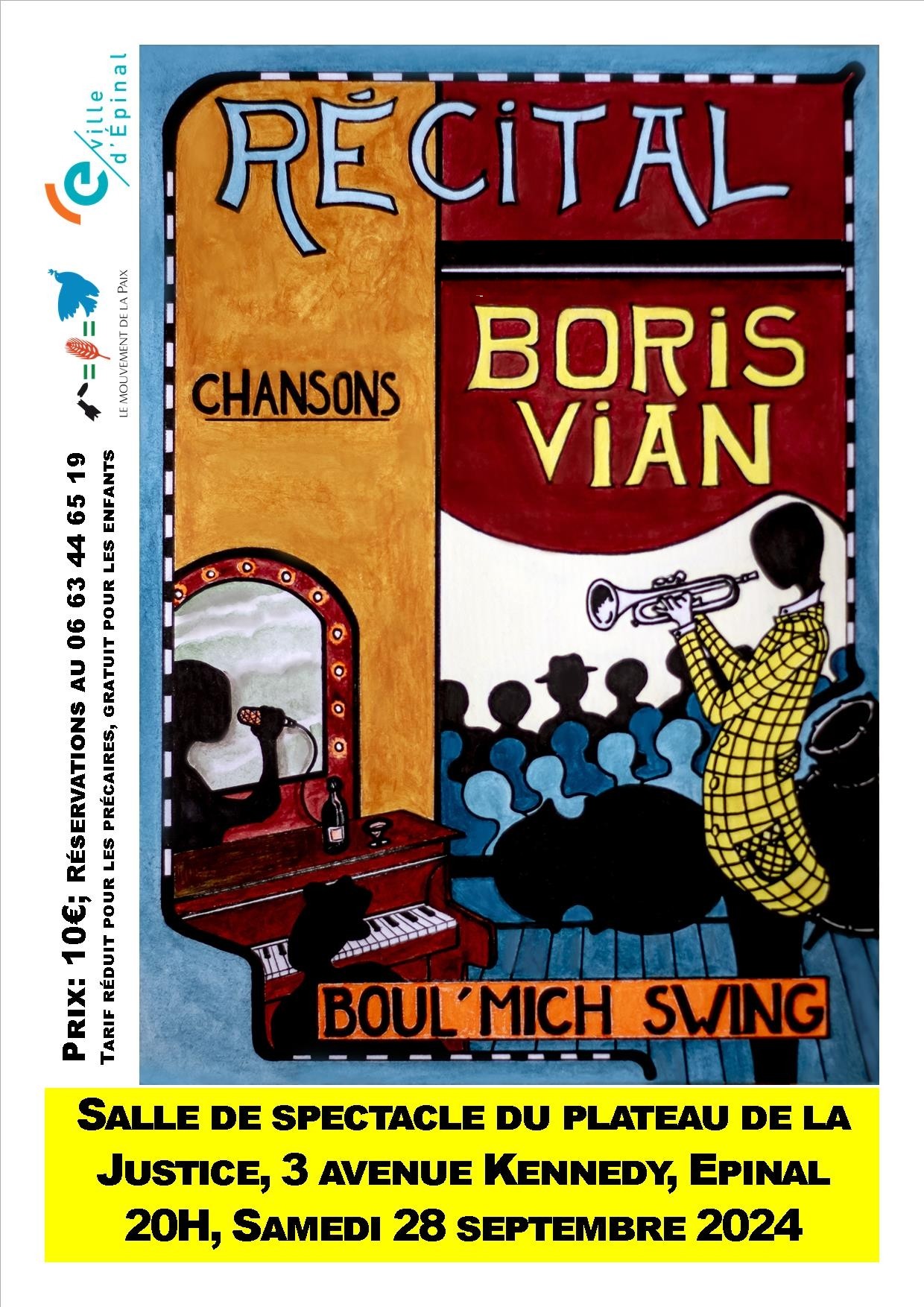 Une soirée organisée par le « Mouvement de la Paix » des Vosges dans une ambiance très « jazz », bien sûr, mais avant tout, Boul’Mich Swing est un concert avec des chansons autour du répertoire de Boris Vian. Sur une mise en espace de Marc Guépratte, on découvre ou redécouvre avec plaisir les textes et chansons de cet artiste aux multiples facettes incontournable de son époque.