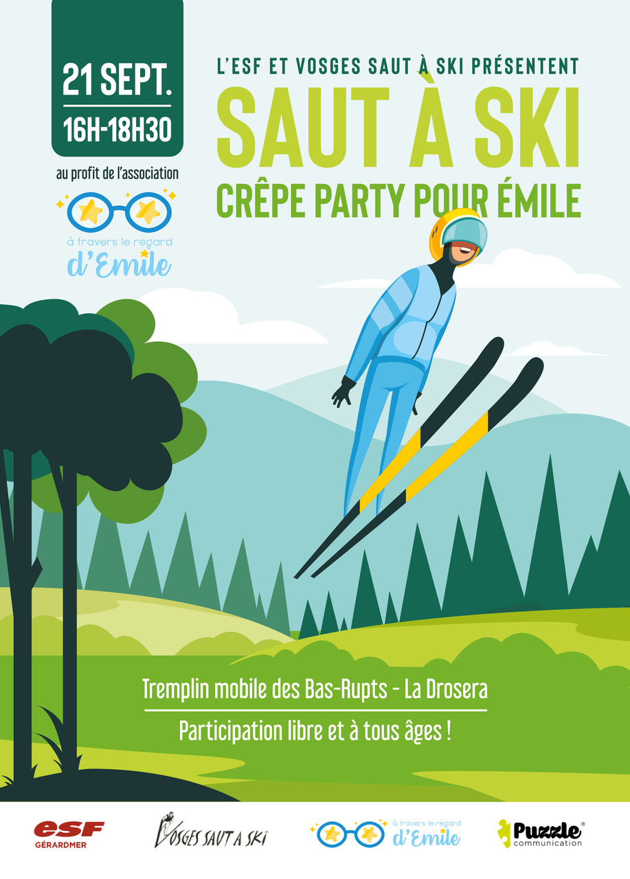 Saut-à-ski et crêpes party pour Émile de 16 h 00 à 18 h 30 au stade de saut des Bas-Rupts à coté du grand tremplin.