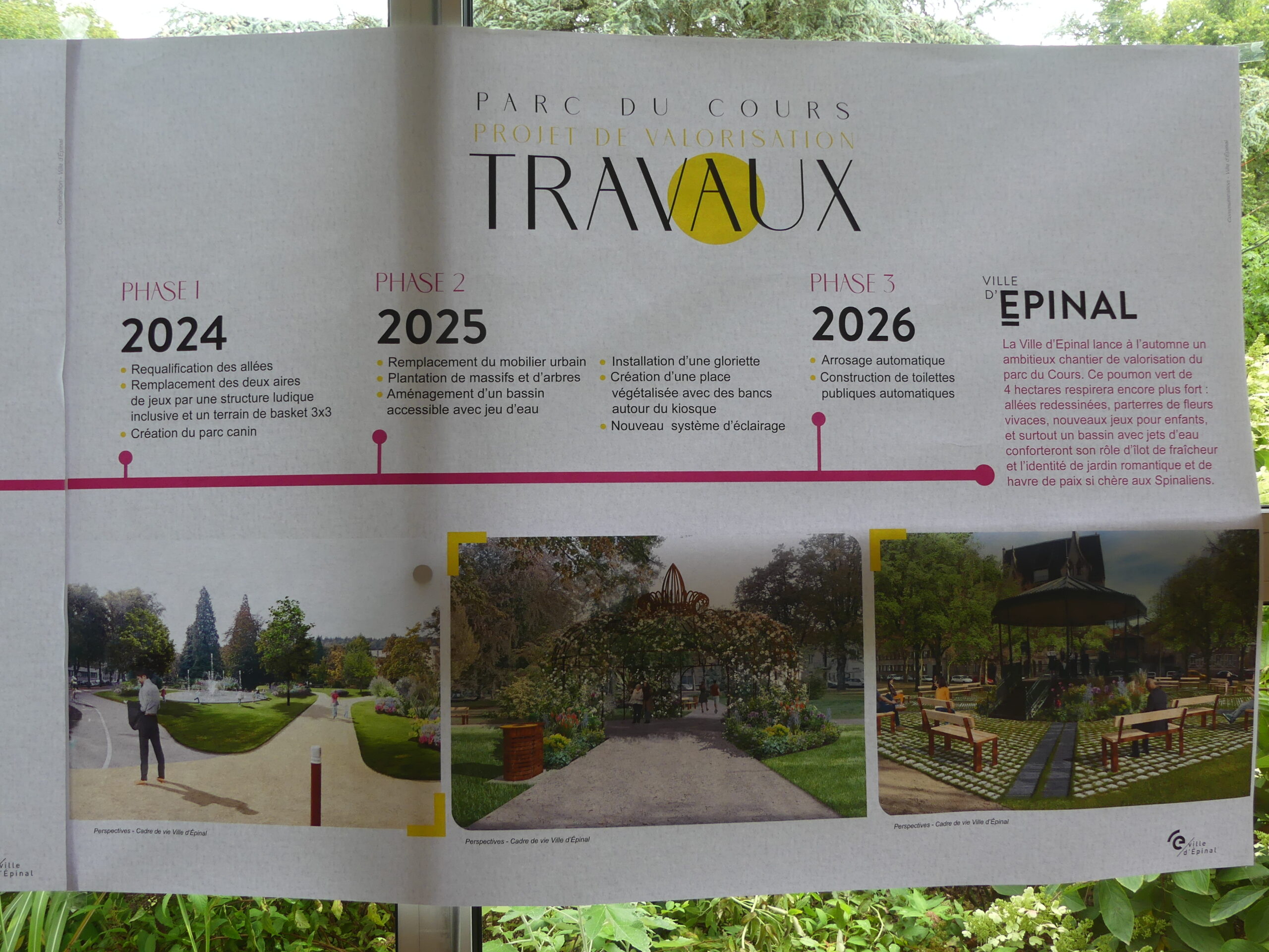Allées redessinées, nouveaux jeux pour enfants, bassin avec jets d’eau, installation d’une gloriette… La ville d’Epinal va réaménager le parc du Cours. Les travaux débuteront le lundi 16 septembre prochain. Le budget de ce projet est de 1,2 million d’euros.