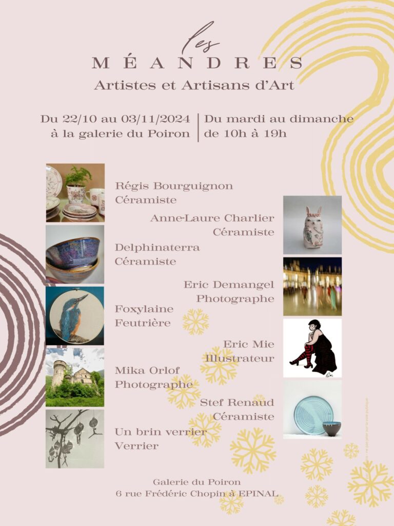 Créée en 2022, Les Méandres est une association qui regroupe 9 artistes et artisans d’art sur le secteur de Bayon. Ils vont investir la galerie du Poiron à Epinal, du 22 octobre au 3 novembre 2024.