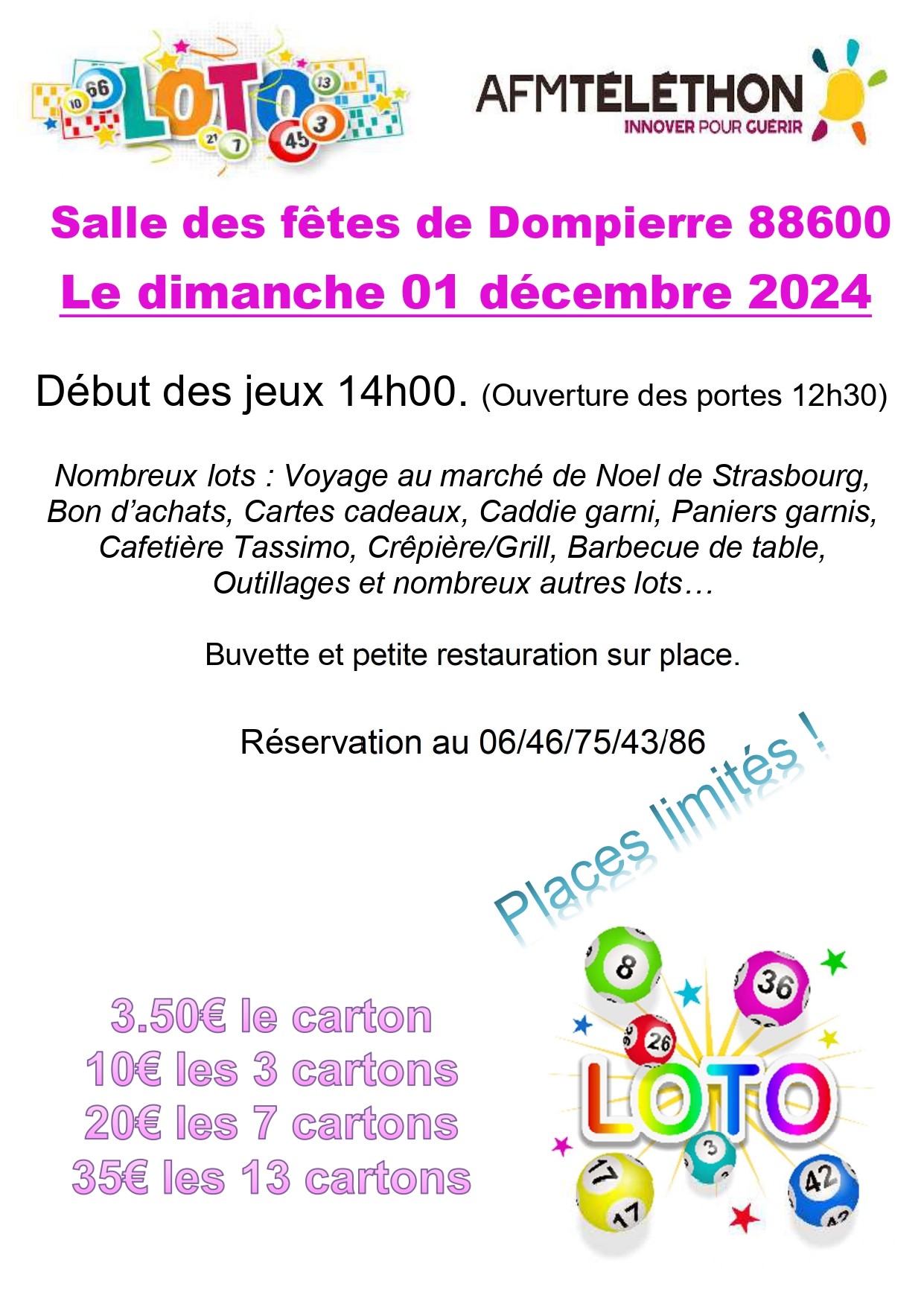 Au regard du succès remporté l’an dernier, Mickaëll de Franciscis se propose d’organiser son deuxieme grand loto au profit du Téléthon, le 1er décembre prochain à la salle polyvalente de Dompierre . Les jeux débuteront à 14 heures mais les portes seront ouvertes dès 12 h 30
