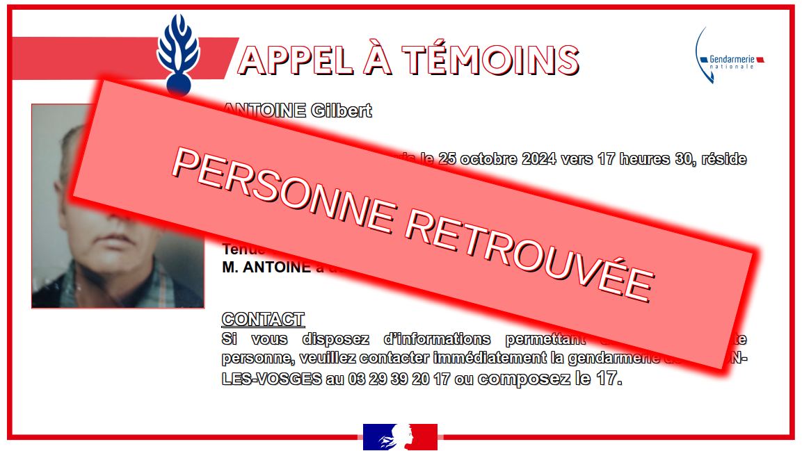 Ce mercredi 30 octobre, Gilbert Antoine, 86 ans, porté disparu depuis vendredi dernier, a été retrouvé mort.La gendarmerie des Vosges avait lancé un avis de recherche vendredi pour tenter de le retrouver.