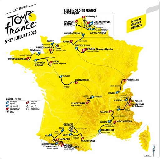 En 2025, la 112e édition du Tour de France s’élancera de Lille et se terminera sur les Champs-Élysées. Après le départ dans le Nord, le peloton passera par la Normandie, la Bretagne, Luchon-Superbagnères et à Peyragudes. Il ne passera pas par les Vosges.