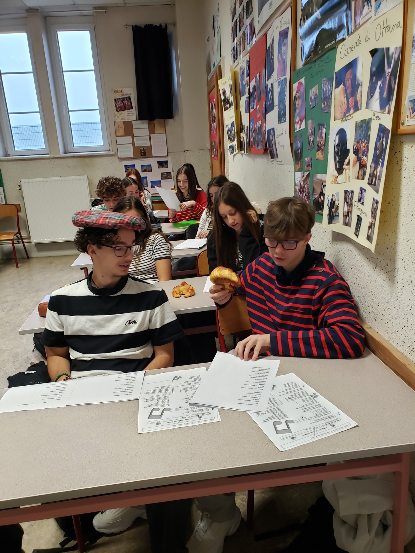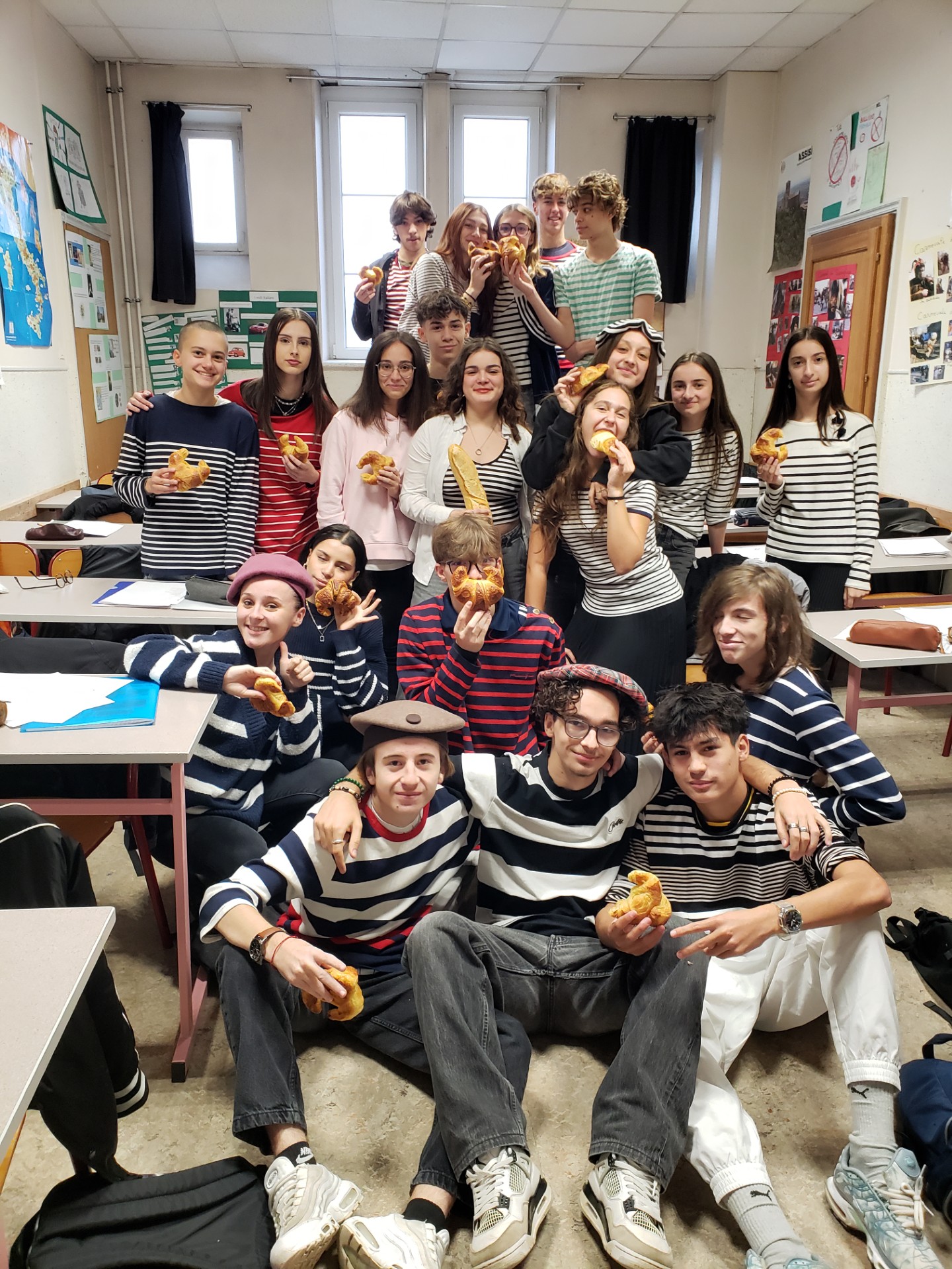 Arrivée à Epinal, dans le cadre d’un échange Trans’Alp, elle a suivi pendant un mois les cours du lycée Claude Gellée et pu ainsi comparer les systèmes scolaires français et italien. Une immersion enrichissante, passionnante, émouvante et pleine de rencontres pour la jeune fille qui quittait pour la 1ère fois sa région d’origine : la Campanie au sud de l’Italie. Accueillie chaleureusement par la famille d’Elsa, sa correspondante, qui lui a fait découvrir ses spécialités culinaires, elle a eu la grande chance aussi de visiter Paris, Colmar et Nancy durant les week-ends. Marilù s’est sentie fort bien accueillie au sein de la classe. Avant de lui souhaiter un bon retour en Italie et avant qu’Elsa la rejoigne à la fin du mois à Salerno, ses nouveaux camarades lui ont écrit une carte et dédié des chansons. Vêtus de marinières et de bérets, ils ont partagé les croissants offerts pour l’occasion.