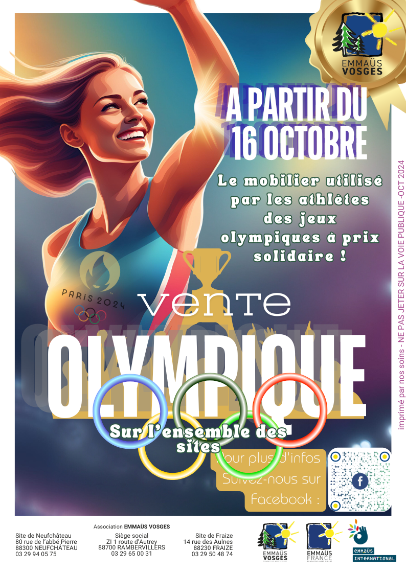 Emmaüs Vosges est fier d’annoncer une vente exceptionnelle à l’occasion de la réception du mobilier utilisé lors des Jeux Olympiques Paris 2024 ! Cet événement inédit vous permettra d’acquérir des pièces uniques tout en soutenant une cause solidaire.