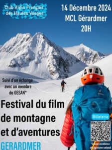 Le Club Alpin Français des Hautes Vosges organise la 1ère édition du Festival du film de montagne et d’aventures de Gérardmer le samedi 14 Décembre 2024 à 20H à la MCL de Gérardmer.