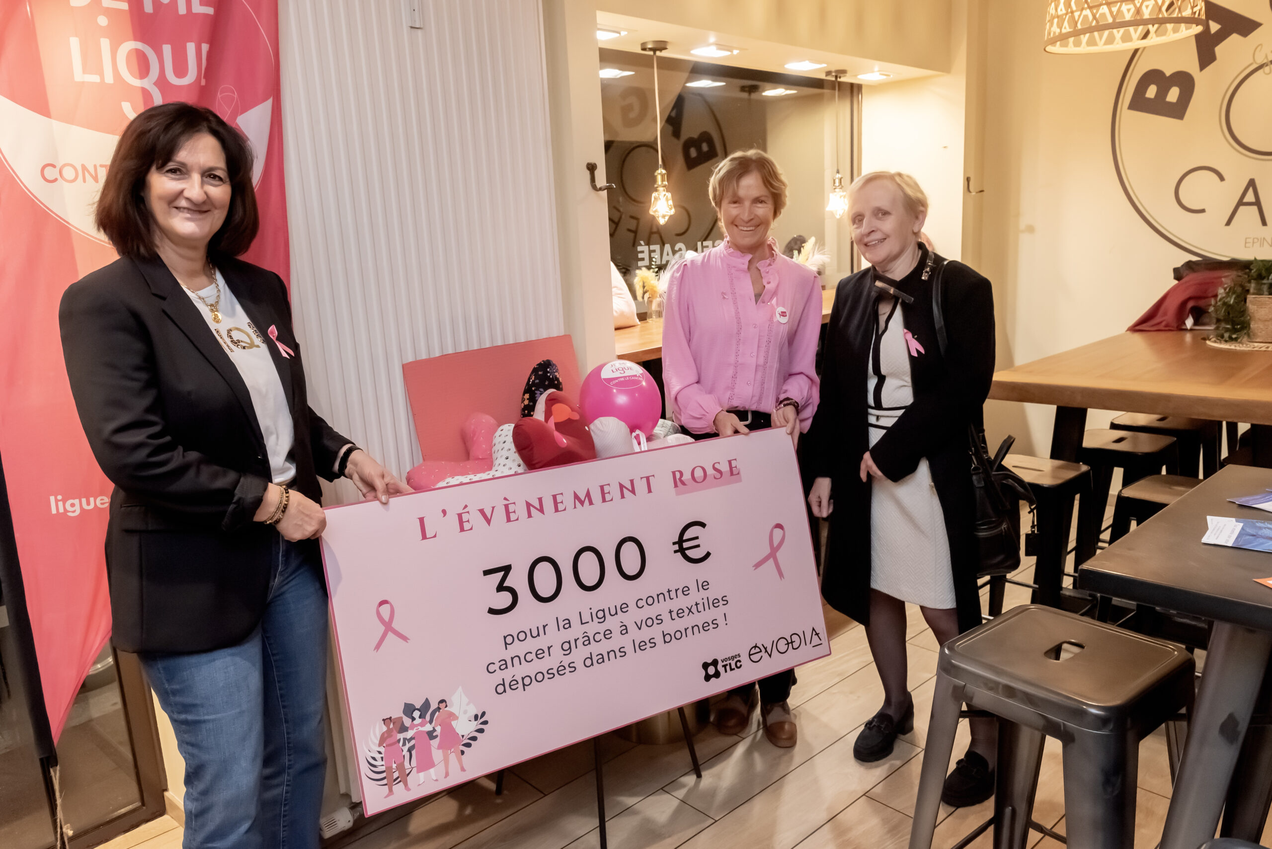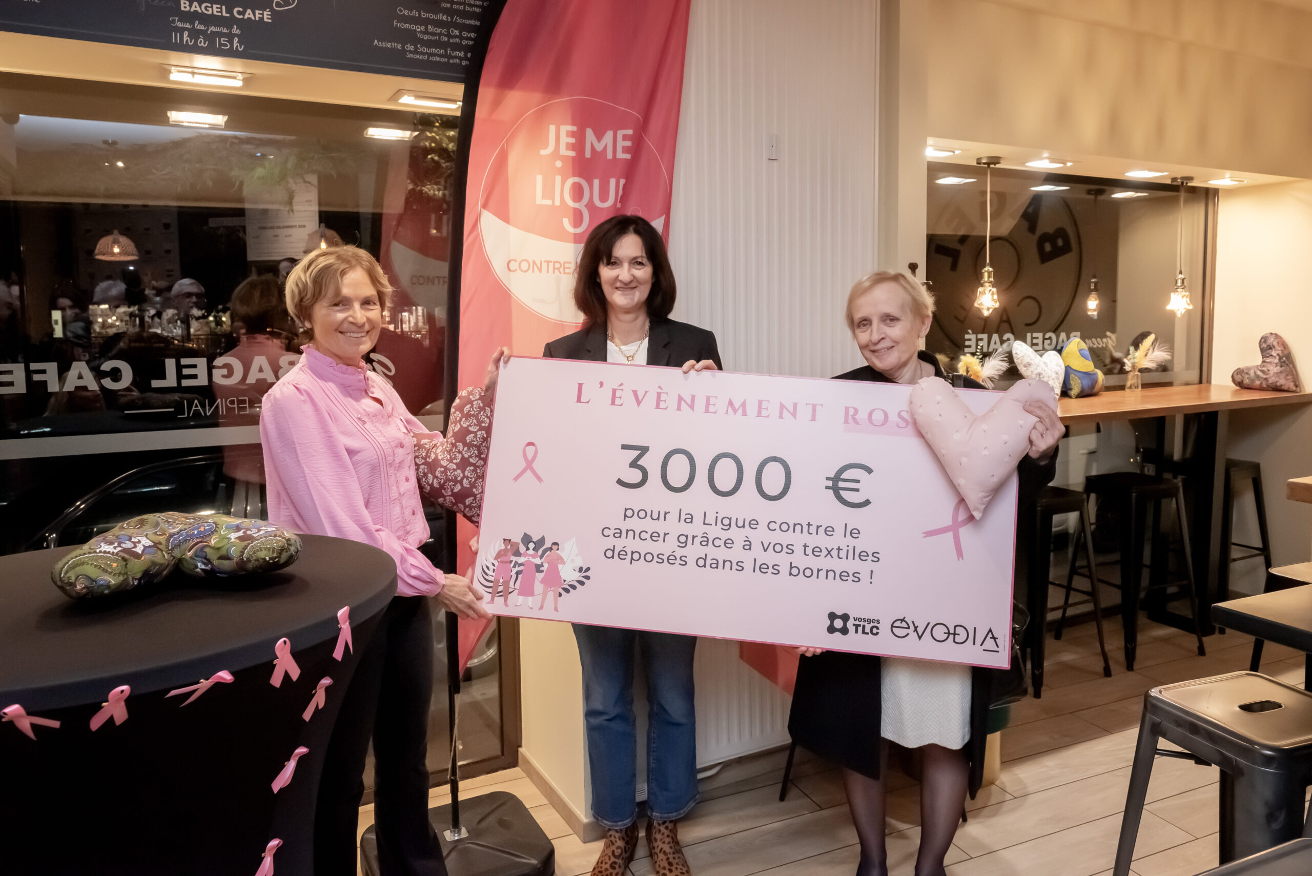 Ce jeudi 7 novembre, avait lieu la soirée de clôture de l’évènement rose, organisé par Evodia. Patrick Largarde, président d’Evodia et de Vosges TLC et Geneviève Potgens, directrice de Vosges TLC, ont remis à la Ligue contre le cancer des Vosges, un chèque de 3000 euros pour la recherche et le dépistage du cancer du sein.Une somme qui a pu être réunie grâce à la grande collecte textiles solidaire organisée en octobre dernier dans les 330 bornes textiles du territoire. Chaque tonne déposée par les Vosgiens a été transformée en un don de 100 euros.