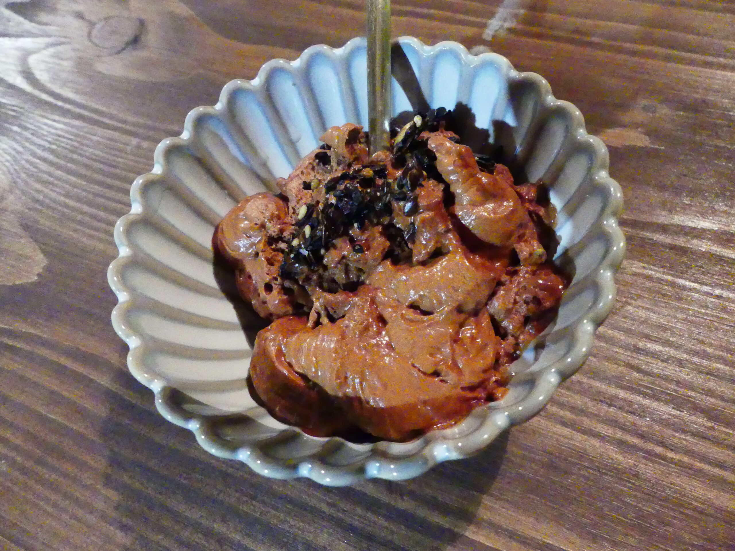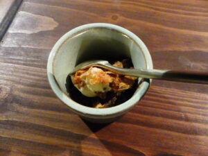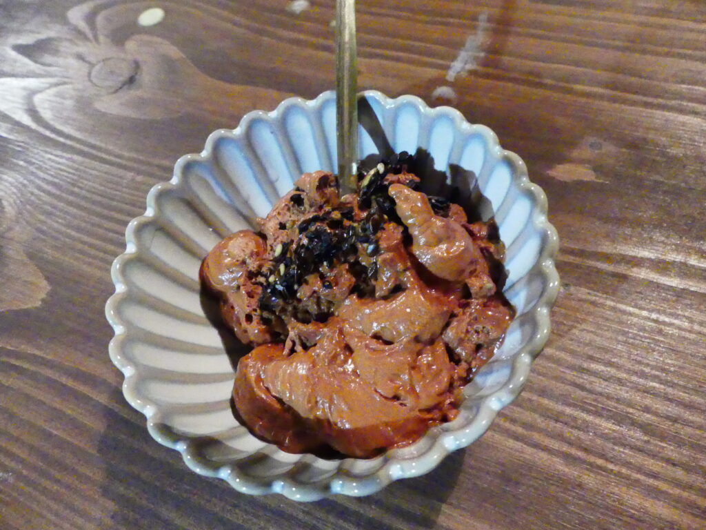 Pour finir en dessert, place à la mousse au chocolat réalisée avec deux ingrédients : du chocolat et de l’eau de pois chiches. L’eau de pois chiche est chauffée, puis versée sur le chocolat. On fouette et on passe le mélange au siphon. On sert avec une petite tuile aux graines de lin, sésame, courge.