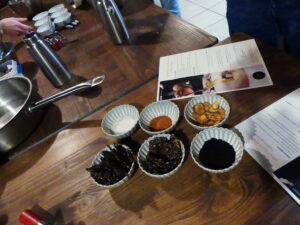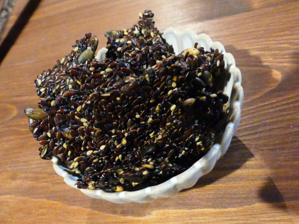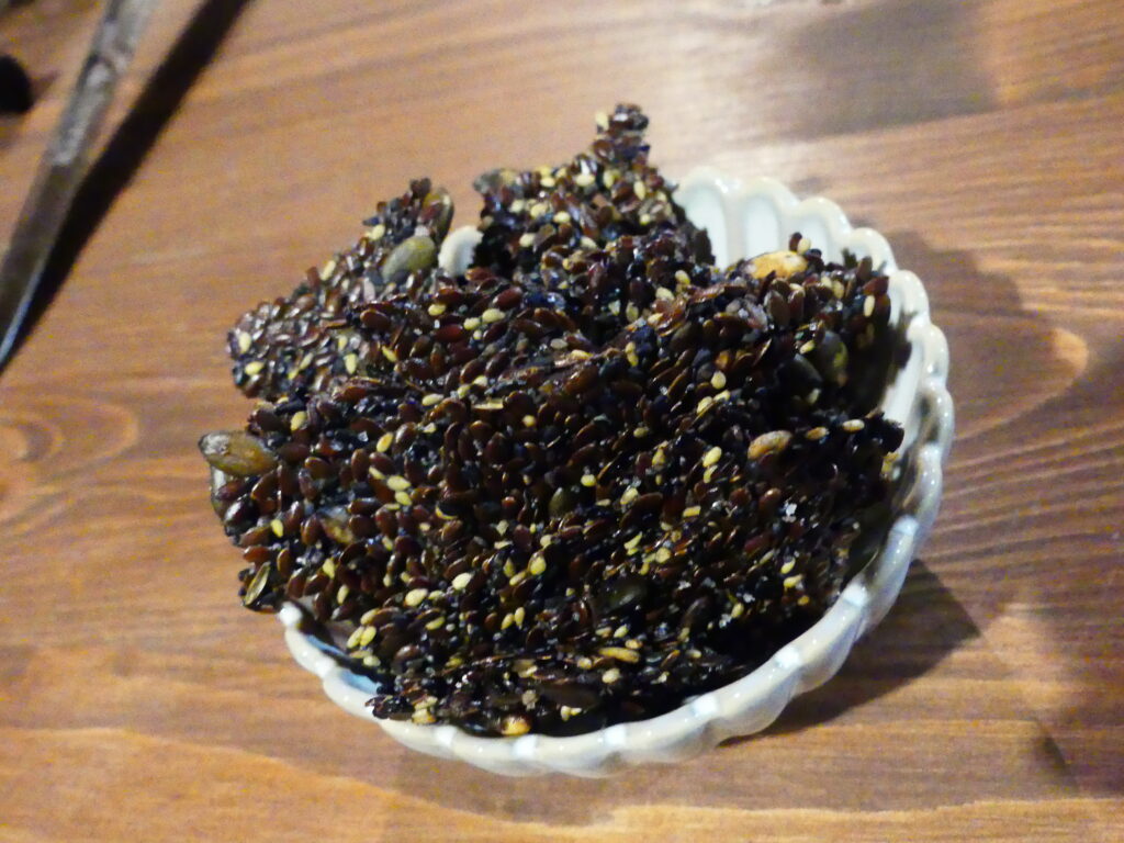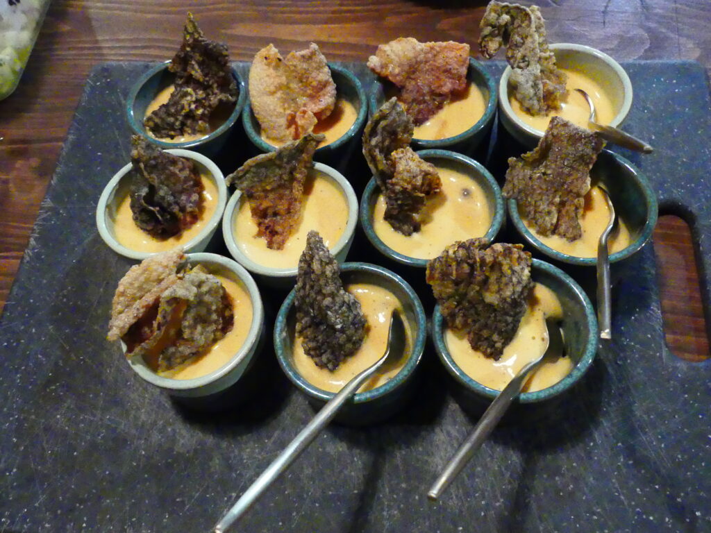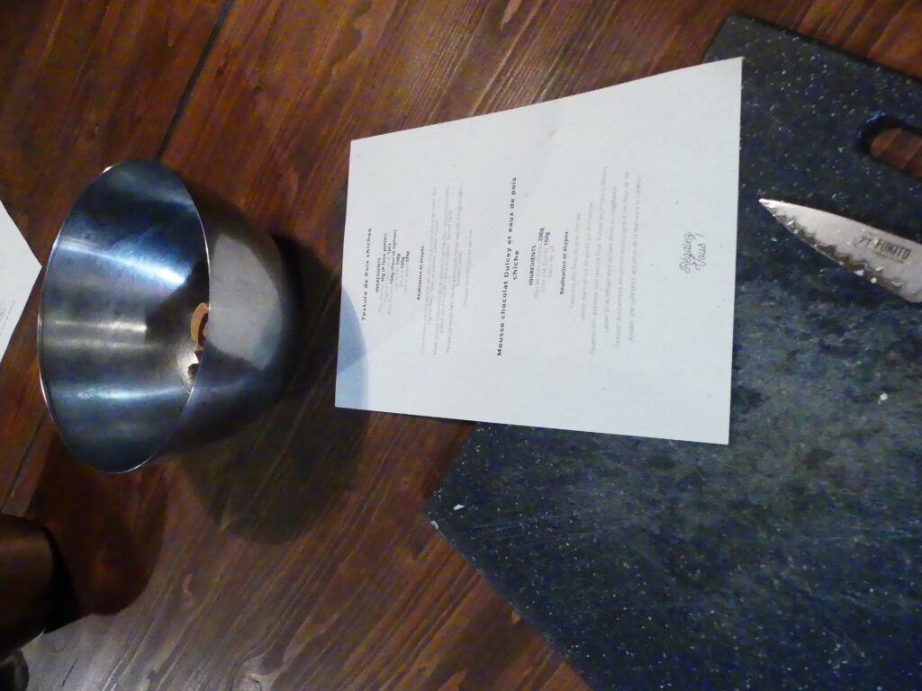 Les chefs proposent également des chips de pelures de topinambour, ou encore de la poudre d’olive avec des morceaux non utilisés, une poudre de potimarron et des tuiles à base de graines de lin, de sésame, de courge et d’eau de pois chiches. Une merveille qui viendra ensuite compléter notre mousse au chocolat.
