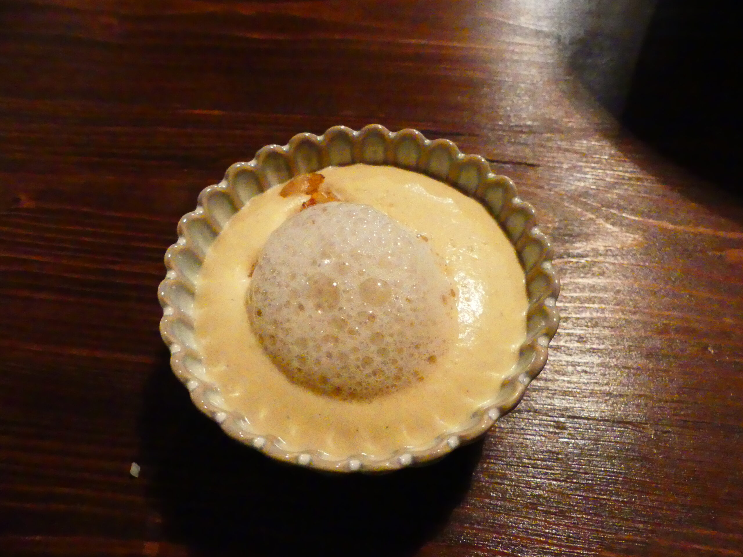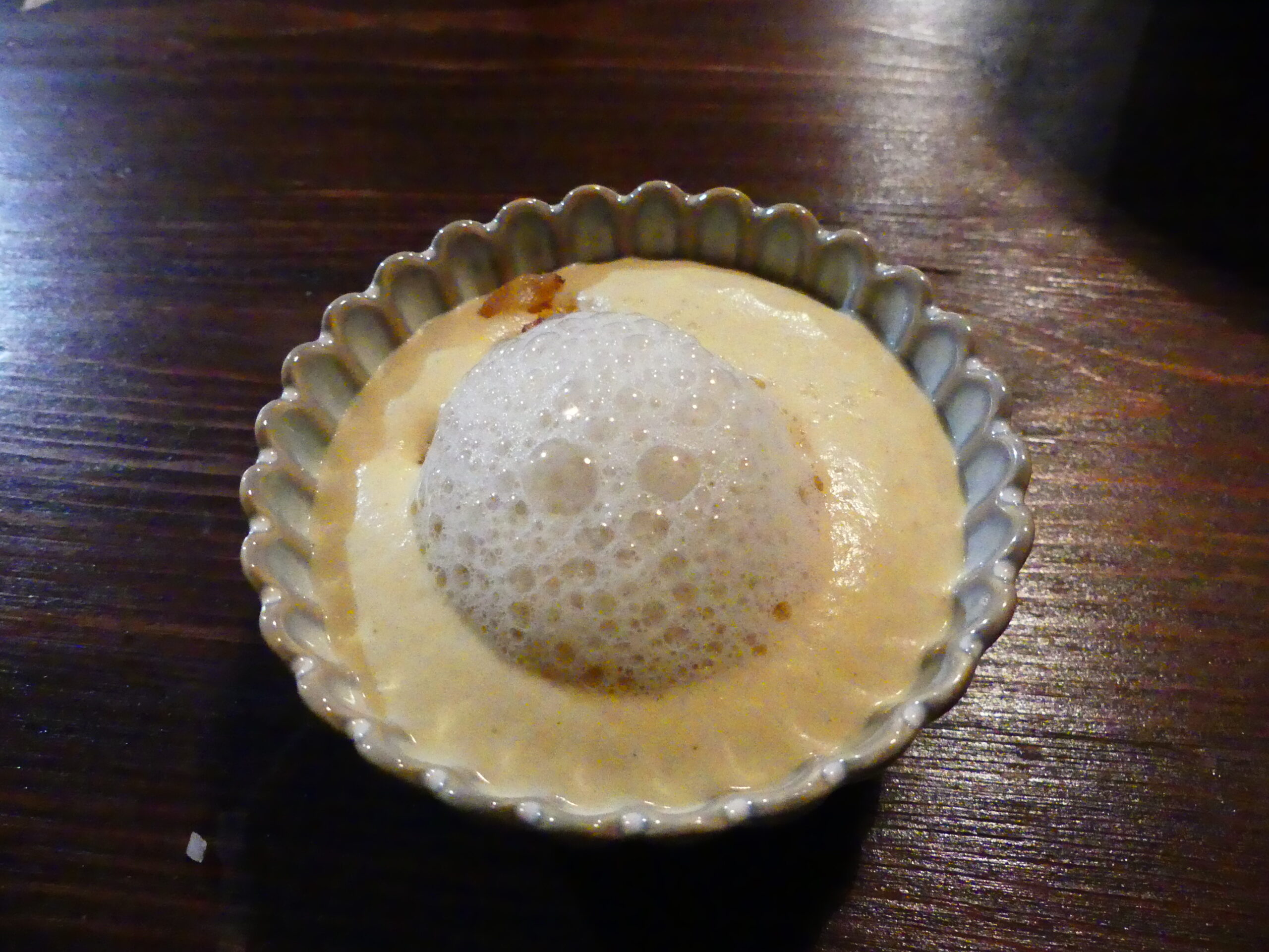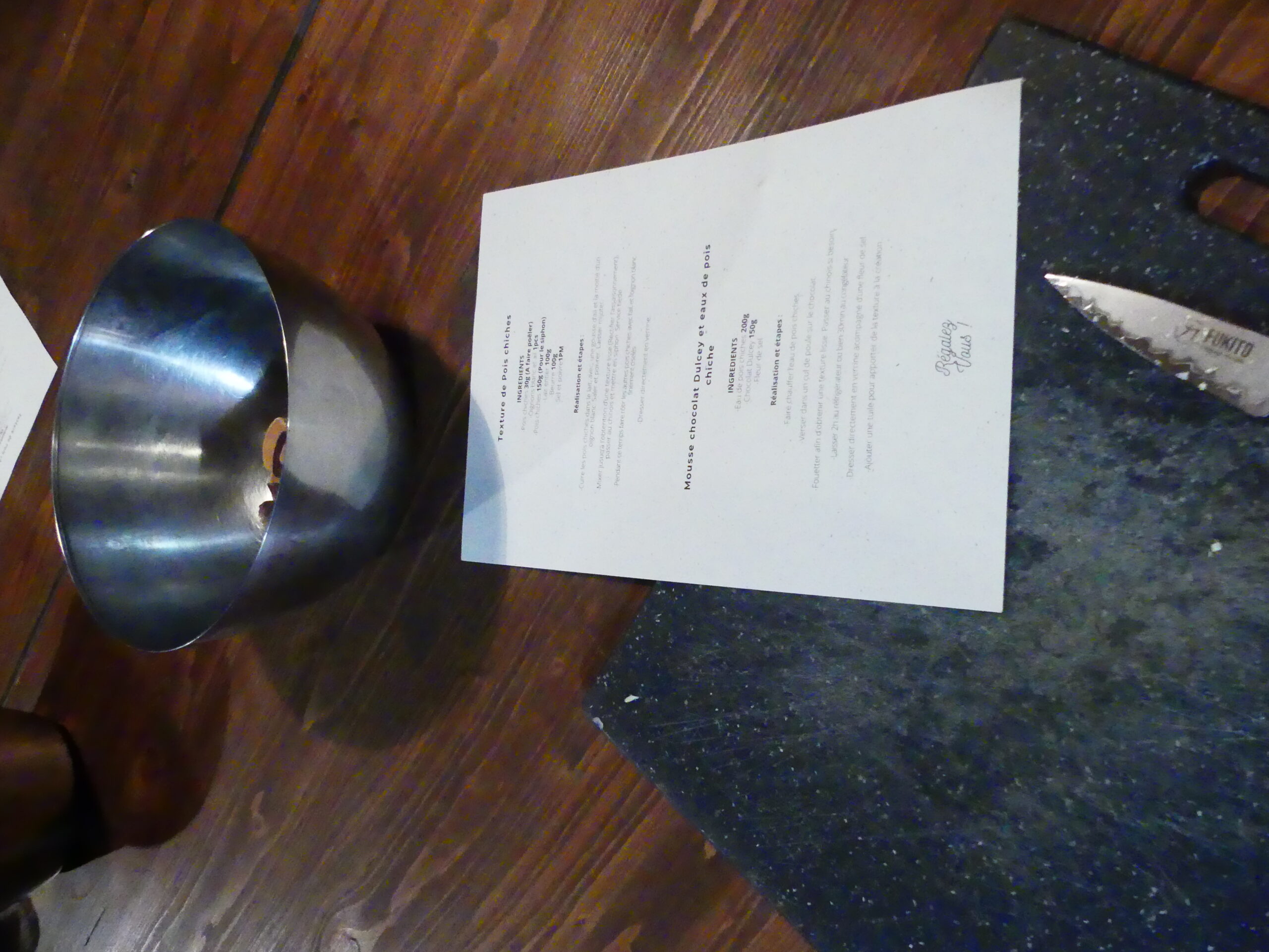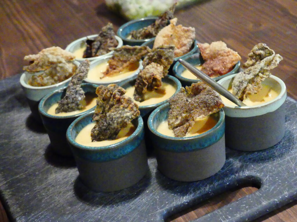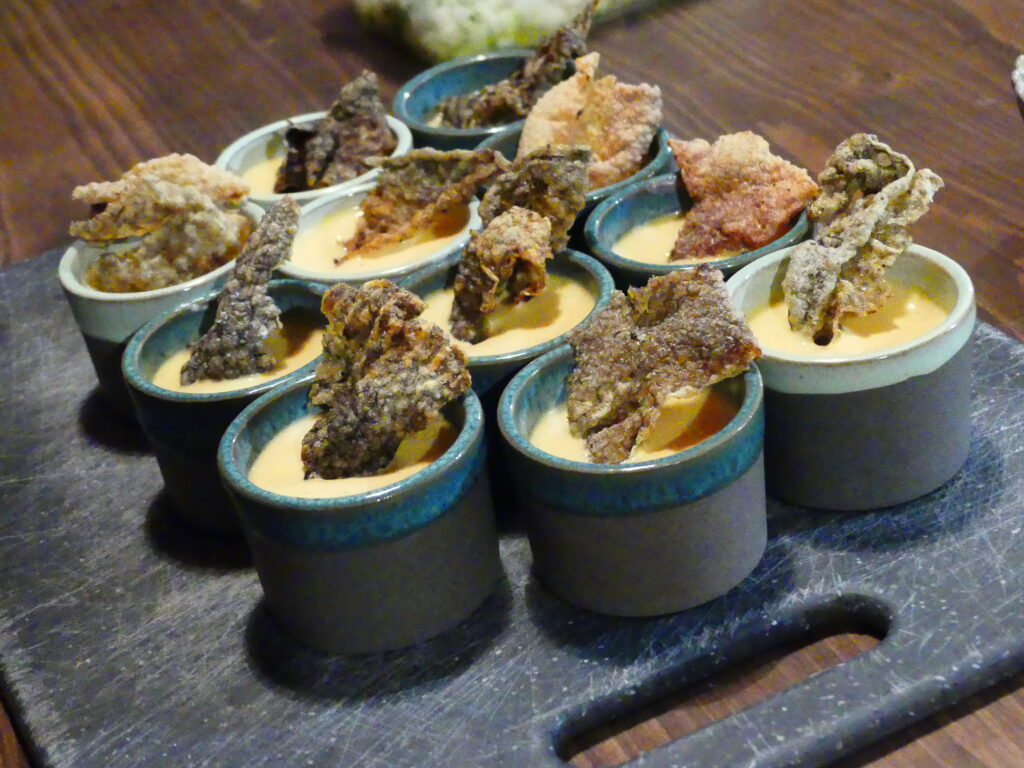 Au menu : une mousse de pois chiches façon houmous revisité. La mousse est cuisinée avec des pois chiches, du lait entier. La mousse est mise dans un siphon pour un effet aérien et on sert dans des petites verrines avec les pois chiches rissolés avec des échalotes et dessus une mousse avec de l’eau de morilles. Un délice !
