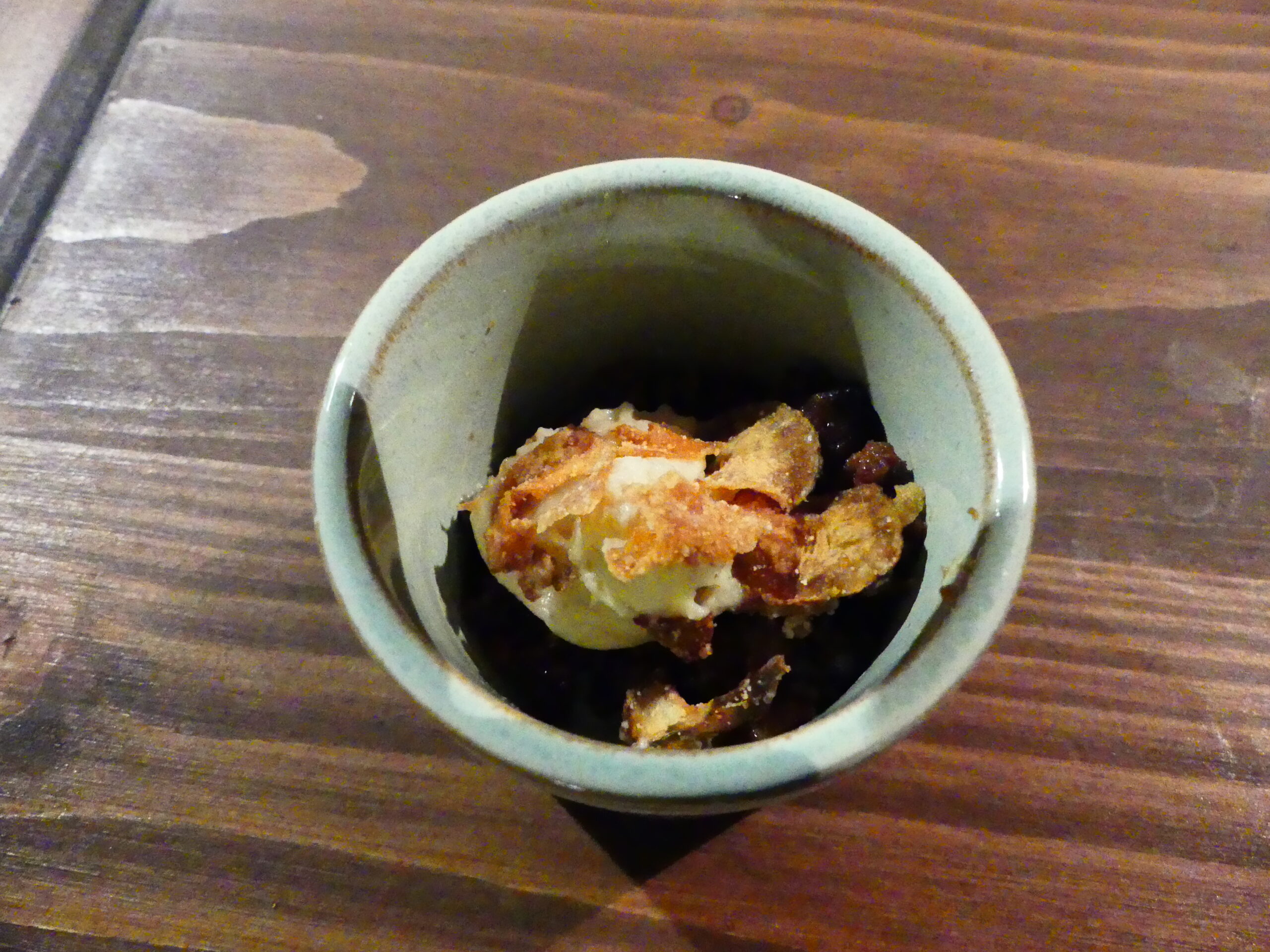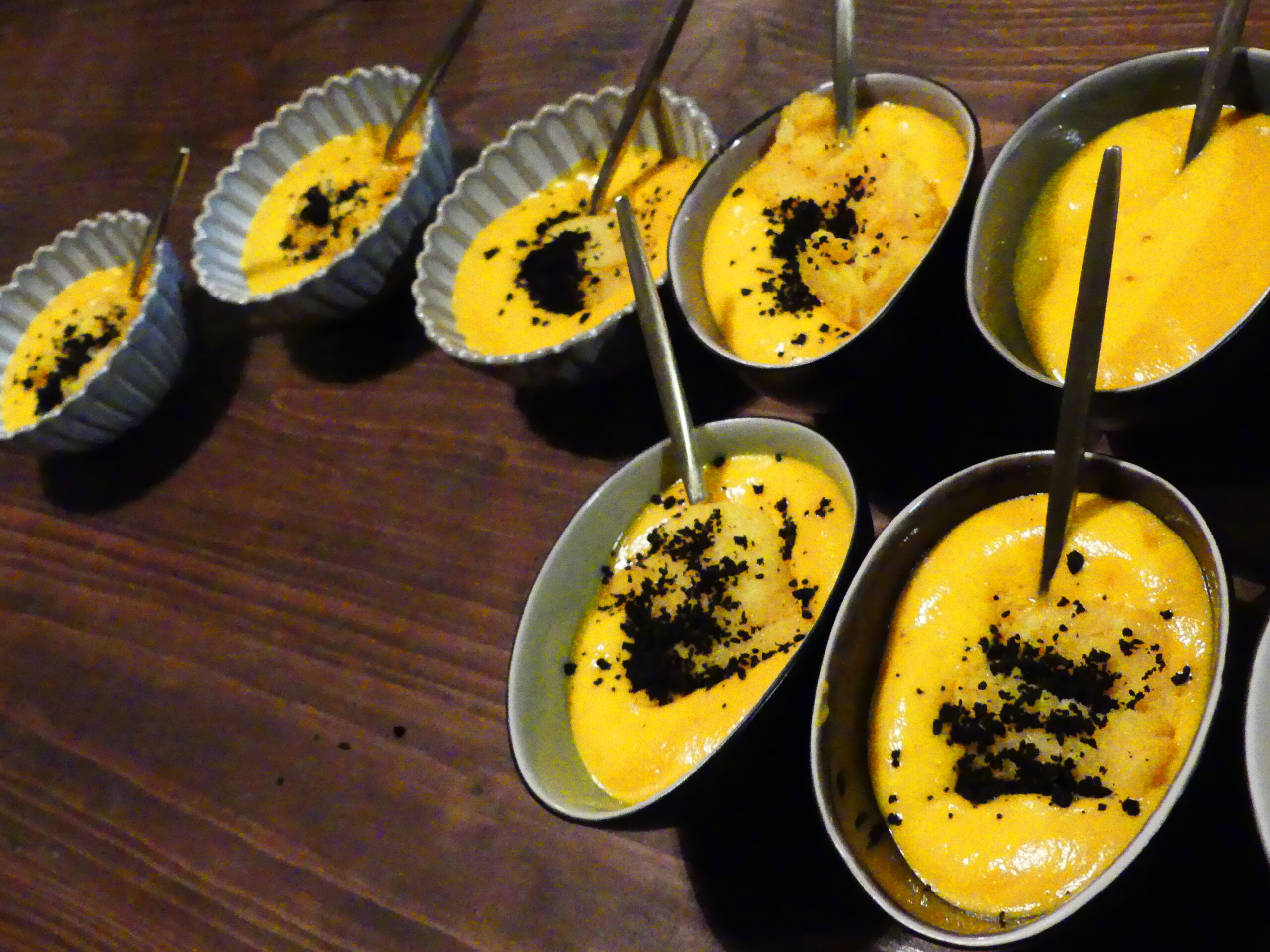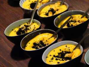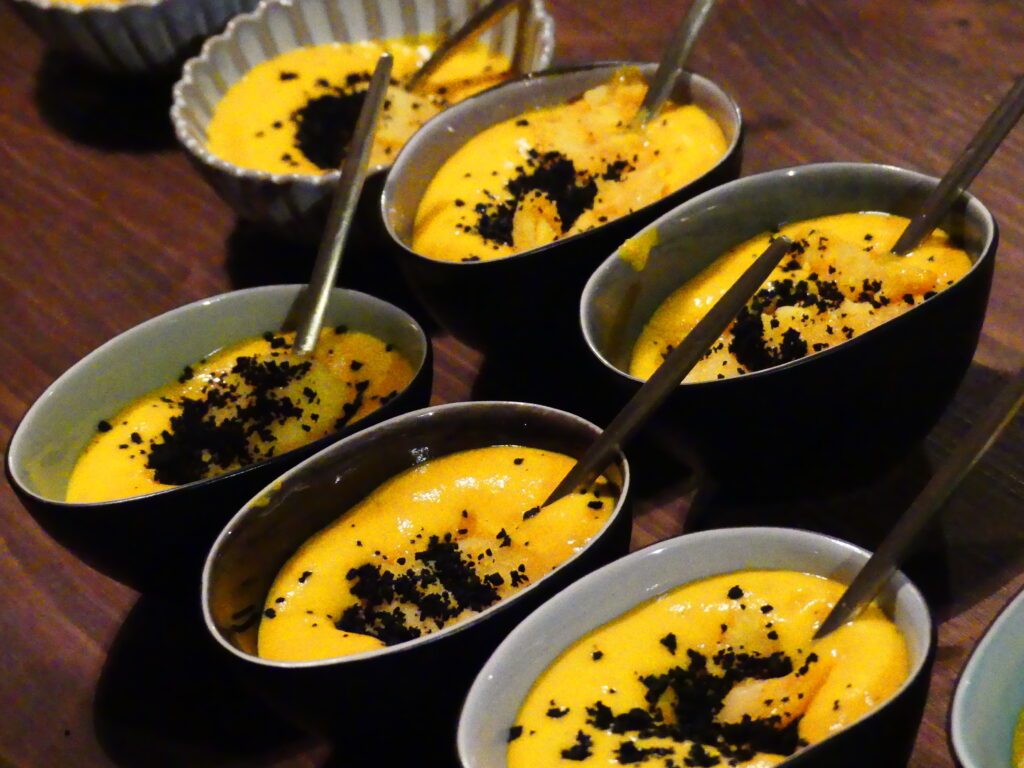 Les chefs ont aussi présenté une verrine à base de potimarron en émulsion, montée au siphon avec une boule de glace sorbet passion. Le potimarron est cuit avec la peau, les graines, puis mixé. Tout se mange. Une verrine version sucré-salée très originale. Dessus, on retrouve les croutes des olives qui ont été séchées.