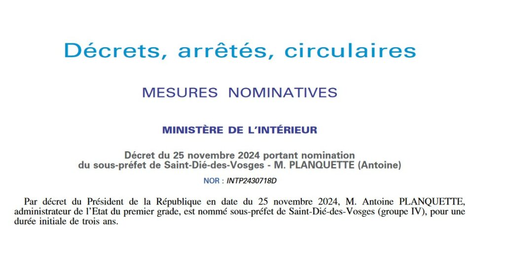 Il s’agit de Antoine Planquette, nommé sous-préfet de Saint-Dié-des-Vosges pour une durée initiale de 3 ans. Une nomination parue au Journal Officiel ce lundi 25 novembre.