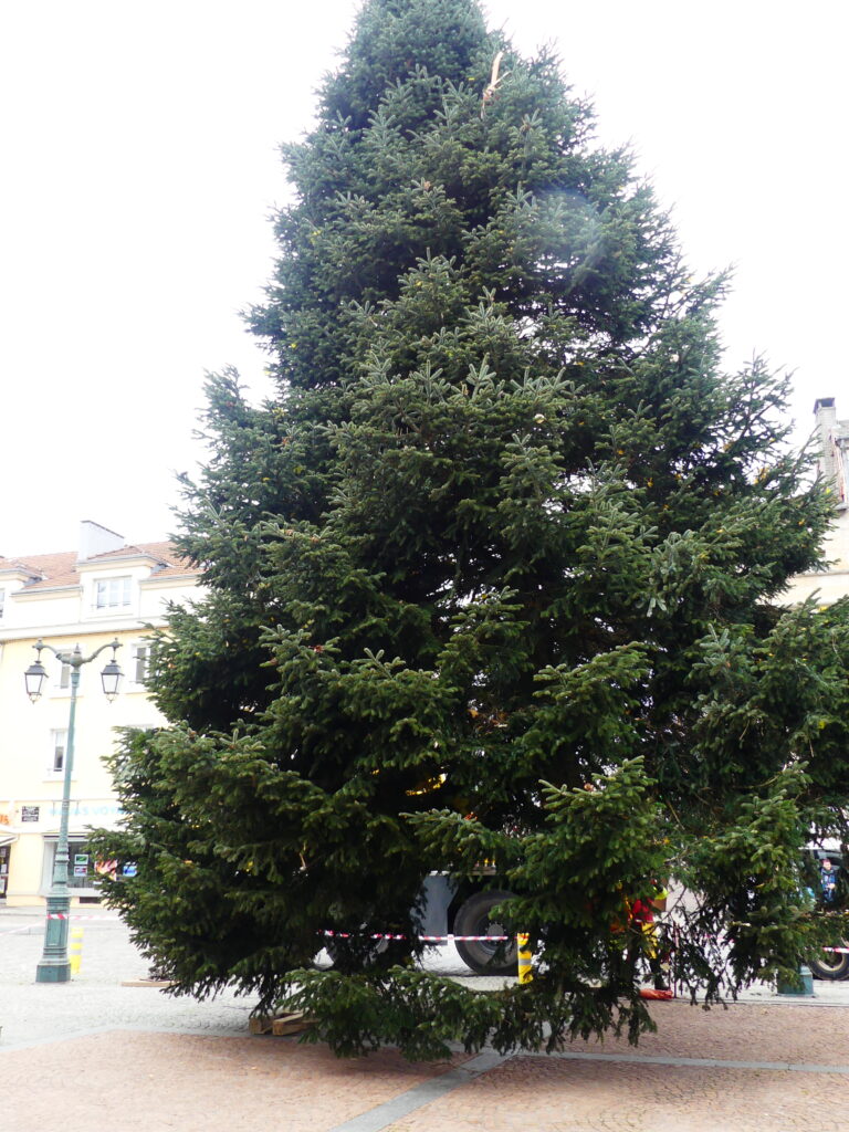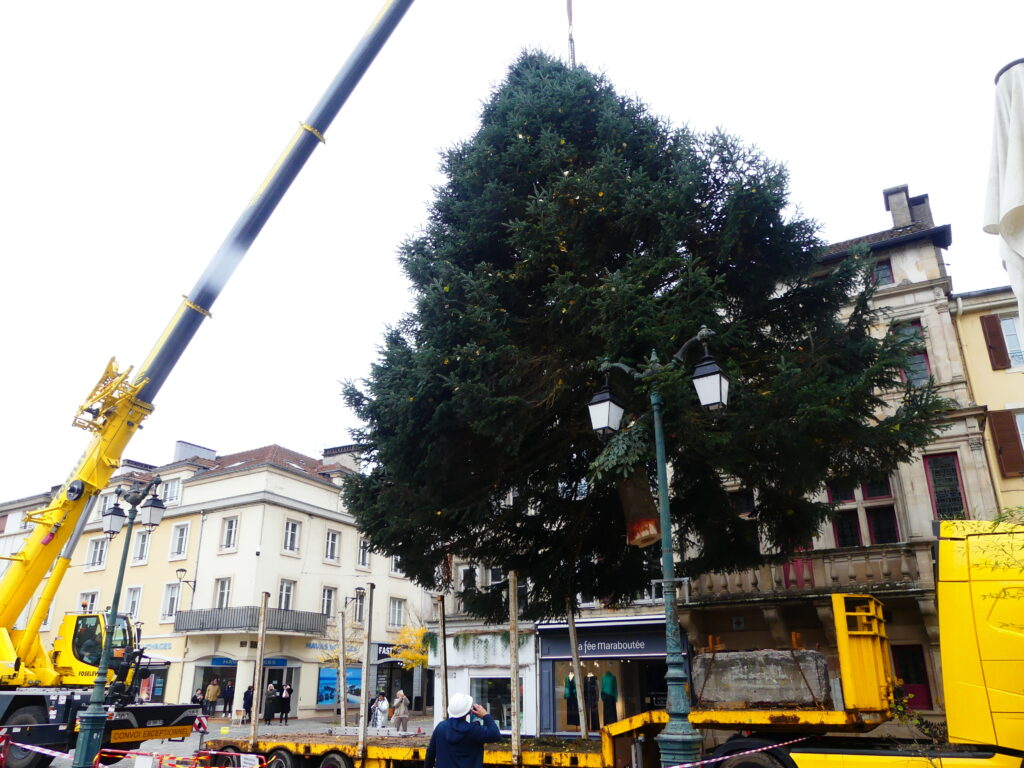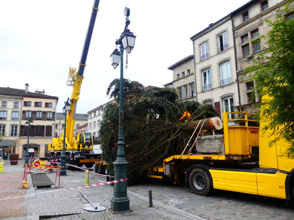 L’arbre, un Nordmann, a été coupé sur le terrain du golf ce matin avant d’être transporté jusqu’à la place des Vosges. Il sera ensuite décoré pour les fêtes de fin d’année.