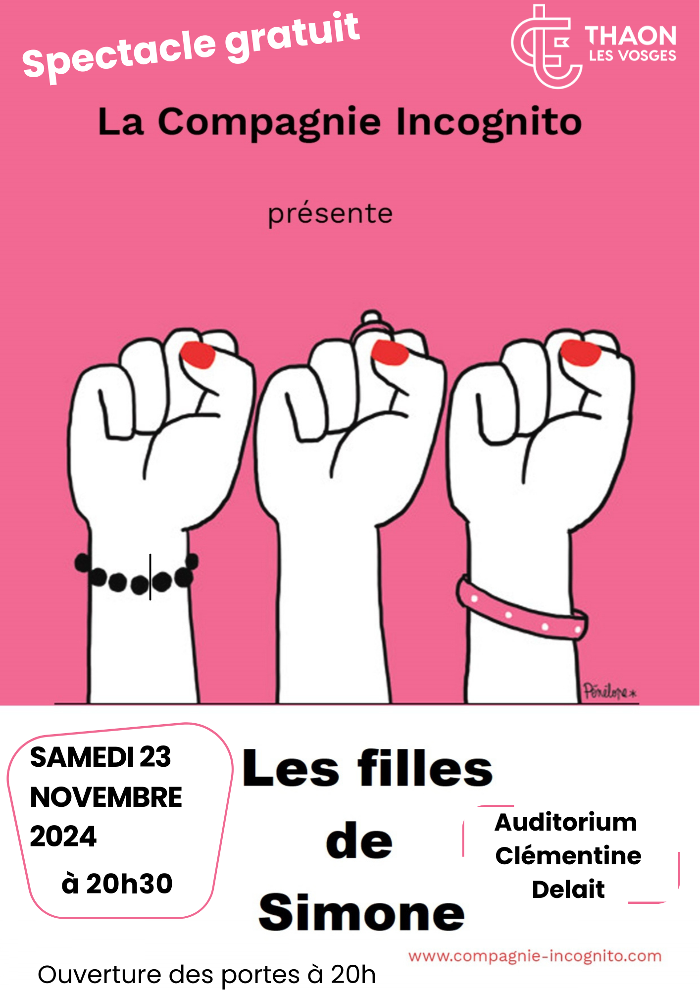 Le spectacle « Les filles de Simone » par la Compagnie Incognito est un spectacle gratuit, organisé par la Ville de Thaon-les-Vosges à l’Auditorium de l’Arche Bernadette le samedi 23 Novembre prochain à partir de 20h30. Ouverture des portes à 20h.