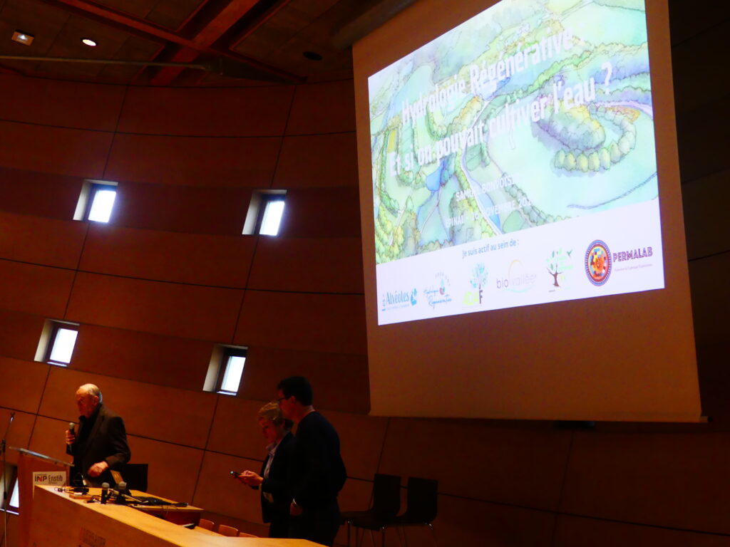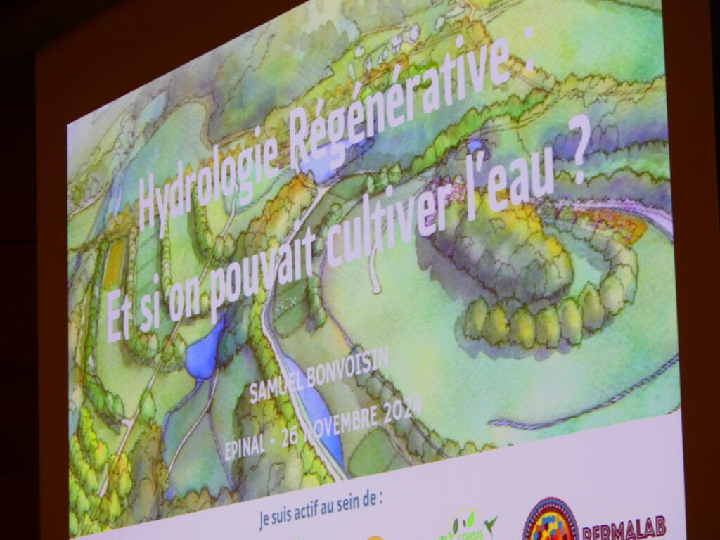 Ingénieur agronome, Samuel Bonvoisin a abordé les pratiques humaines qui ont perturbé ces cycles, notamment le remembrement agricole, la perte de matière organique dans les sols, et le drainage massif des parcelles agricoles. Samuel Bonvoisin a présenté l’hydrologie régénérative. L’objectif est de restaurer les cycles de l’eau douce par l’aménagement du territoire.