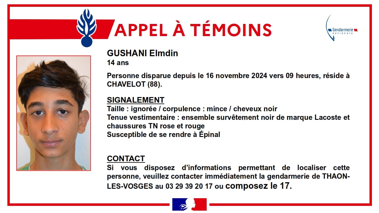 La Gendarmerie des Vosges lance un appel à témoins, suite à la disparition inquiétante ce samedi 16 novembre de Gushani Elmdin, qui habite à Chavelot.