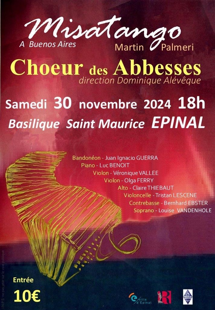 La MISATANGO (MESSE A BUENOS AIRES) connaît un succès planétaire depuis quelques années et les plus grands chœurs l’ont inscrit à leur répertoire. C’est une œuvre éclatante et envoutante qui sera interprétée LE SAMEDI 30 NOVEMBRE à 18h à la BASILIQUE SAINT MAURICE D’EPINAL par le chœur des Abbesses de REMIREMONT composé de 36 choristes dirigés par Dominique ALEVEQUE, Cheffe De chœur et présidée par Dominique REICHERT MILLET.