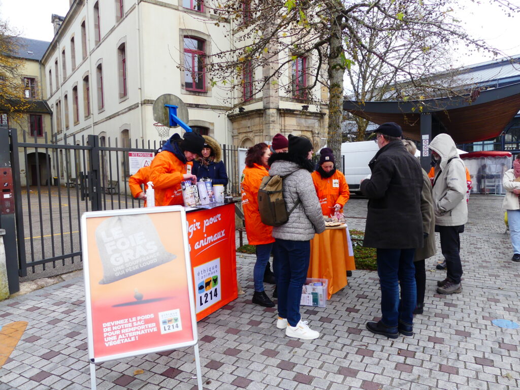 A l’approche des fêtes de fin d’année, des militants vosgiens de l’association L214 étaient sur le marché d’Epinal, place Georgin, ce samedi 30 novembre, pour une action de sensibilisation contre le gavage des canards.