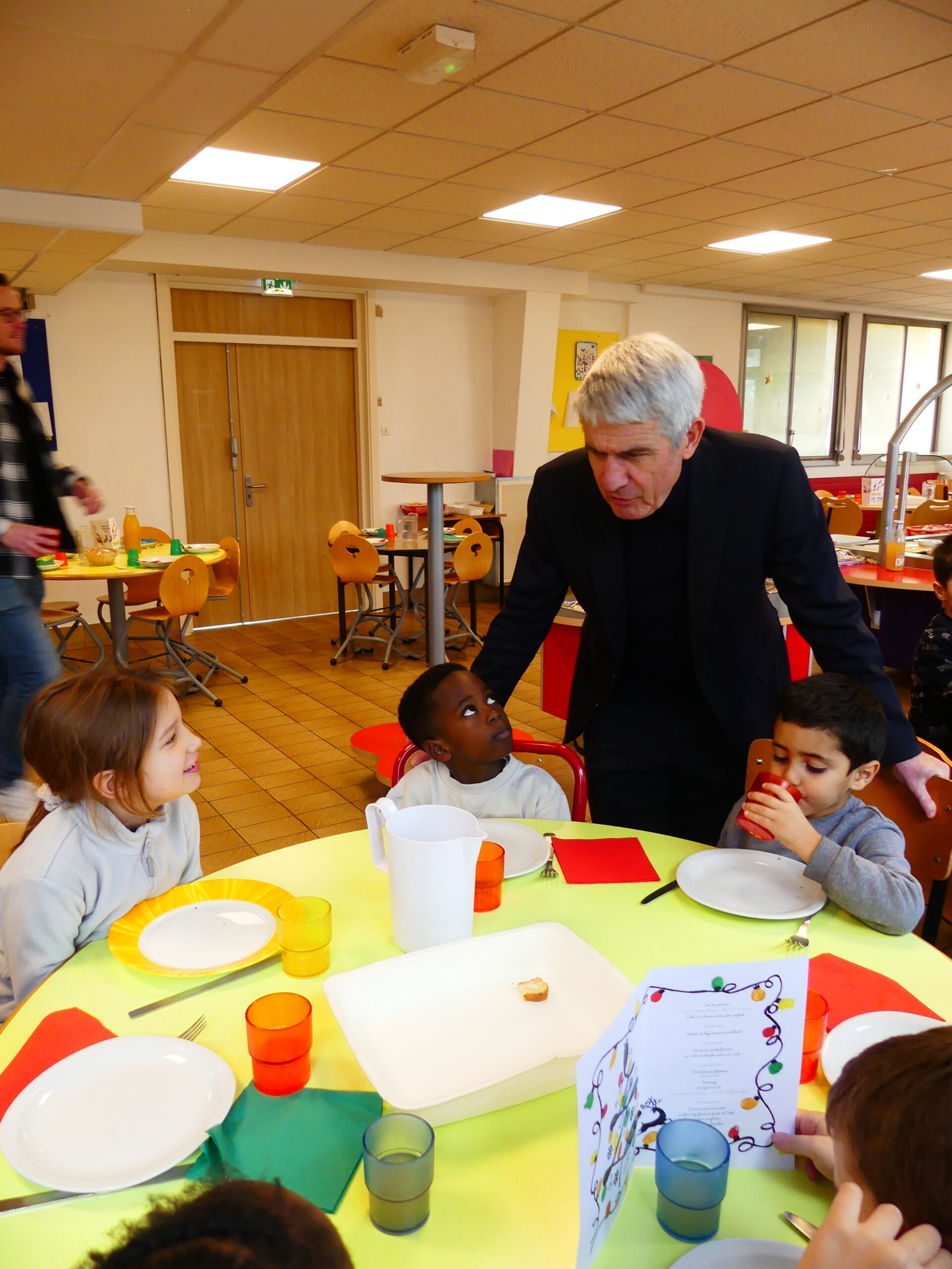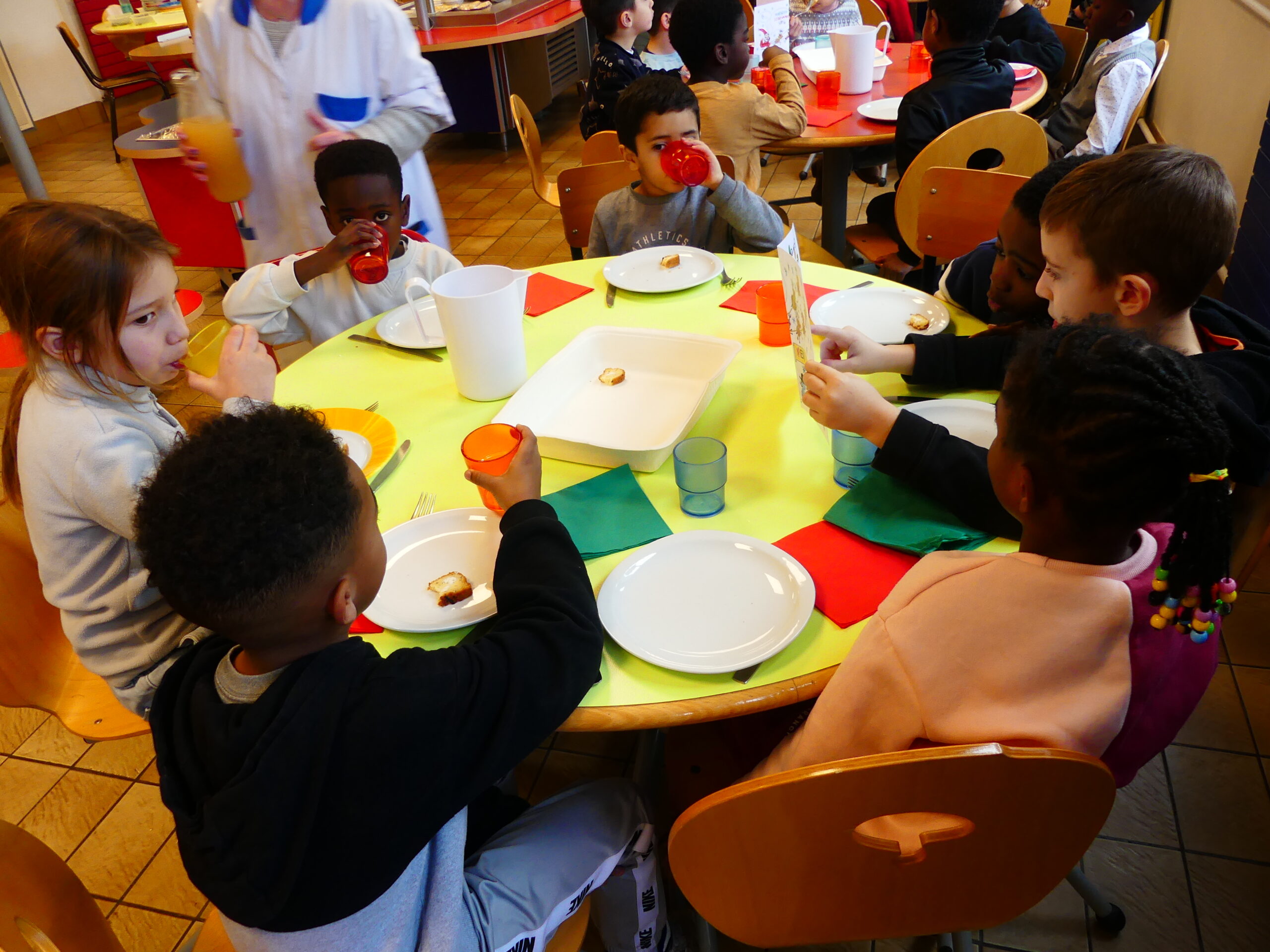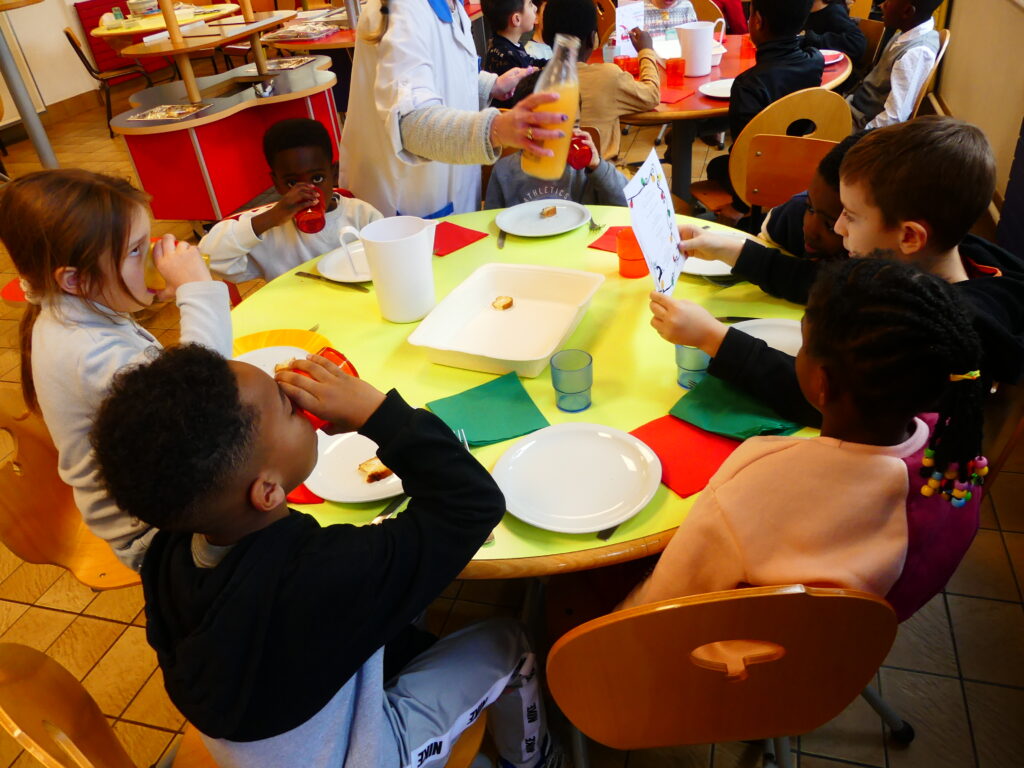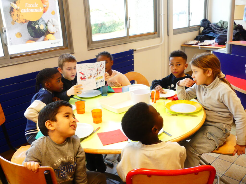 Le menu du jour a remporté un vif succès : jus de pomme, cake au chèvre et tomates confites, terrine de légumes sauce cocktail, sauté de poulet fermier ou Colin d’Alaska sauce au miel, fromage et en dessert un fondant pommes-poires au fromage frais et aux épices de Noël et crème anglaise. Pour finir en beauté, les enfants ont reçu un Père Noël en chocolat.