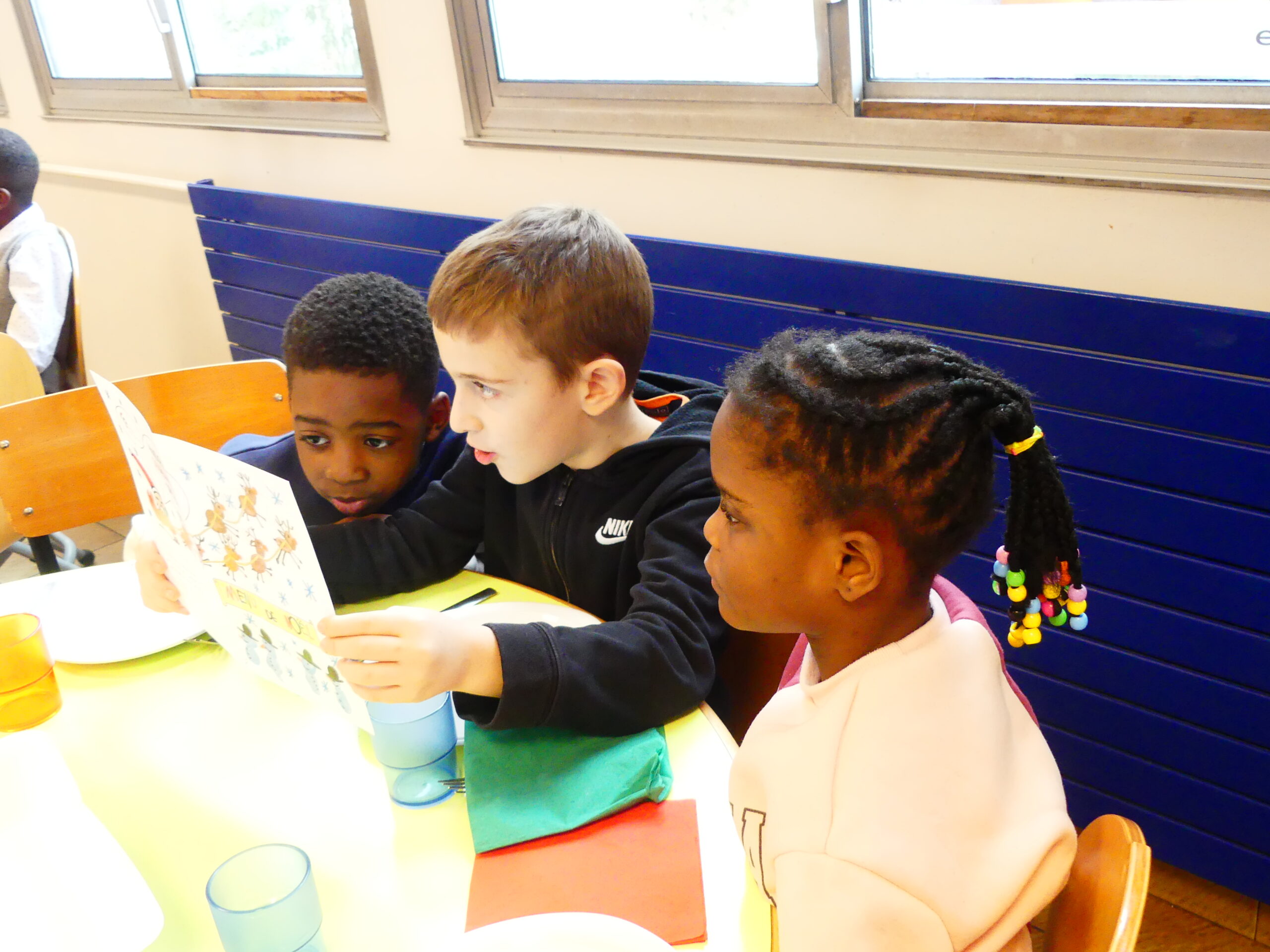 L’illustration qui figure sur le menu, a été imaginée par les élèves de Grande Section de Maternelle du groupe scolaire Gaston Rimay.