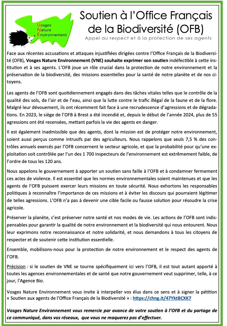 Face aux récentes accusations et attaques injustifiées dirigées contre l’Office Français de la Biodiversité (OFB), Vosges Nature Environnement (VNE) souhaite exprimer son soutien indéfectible à cette institution et à ses agents.