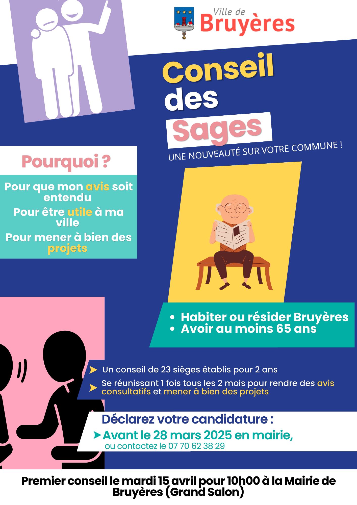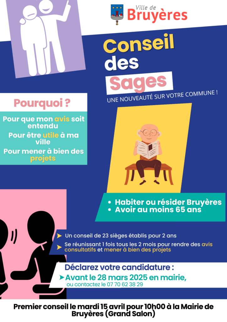Le 15 Avril prochain à 10h en mairie, le premier conseil des sages de la commune de Bruyères sera installé. 23 Conseillers de plus de 65 ans et résidant Bruyères seront tirés au sort parmi les inscrits (inscription à l’accueil de la mairie ou au 07 70 62 38 29). Sous le suivi de la municipalité, ils seront consultés sur les thématiques qui les concernent, émettront des avis et pourront porter des projets concrets en lien avec leur quotidien.jeudi 30 avril